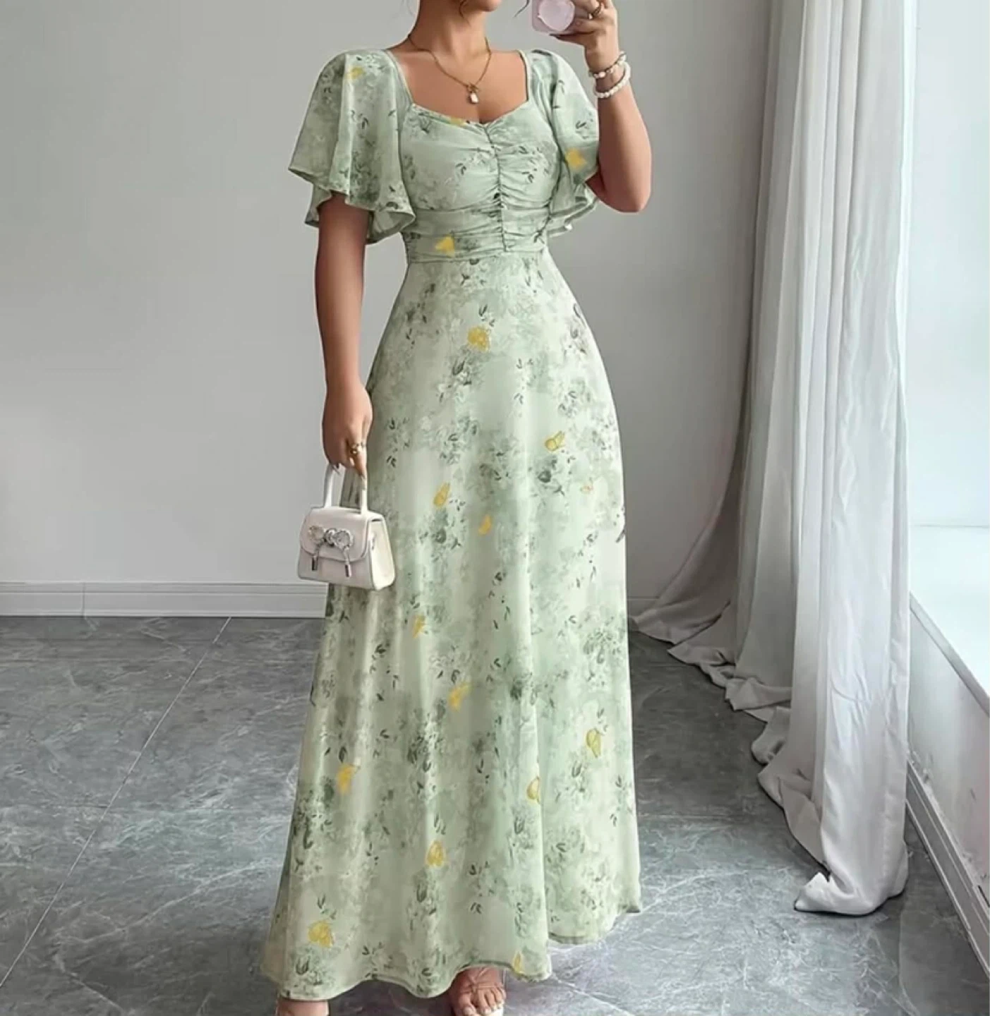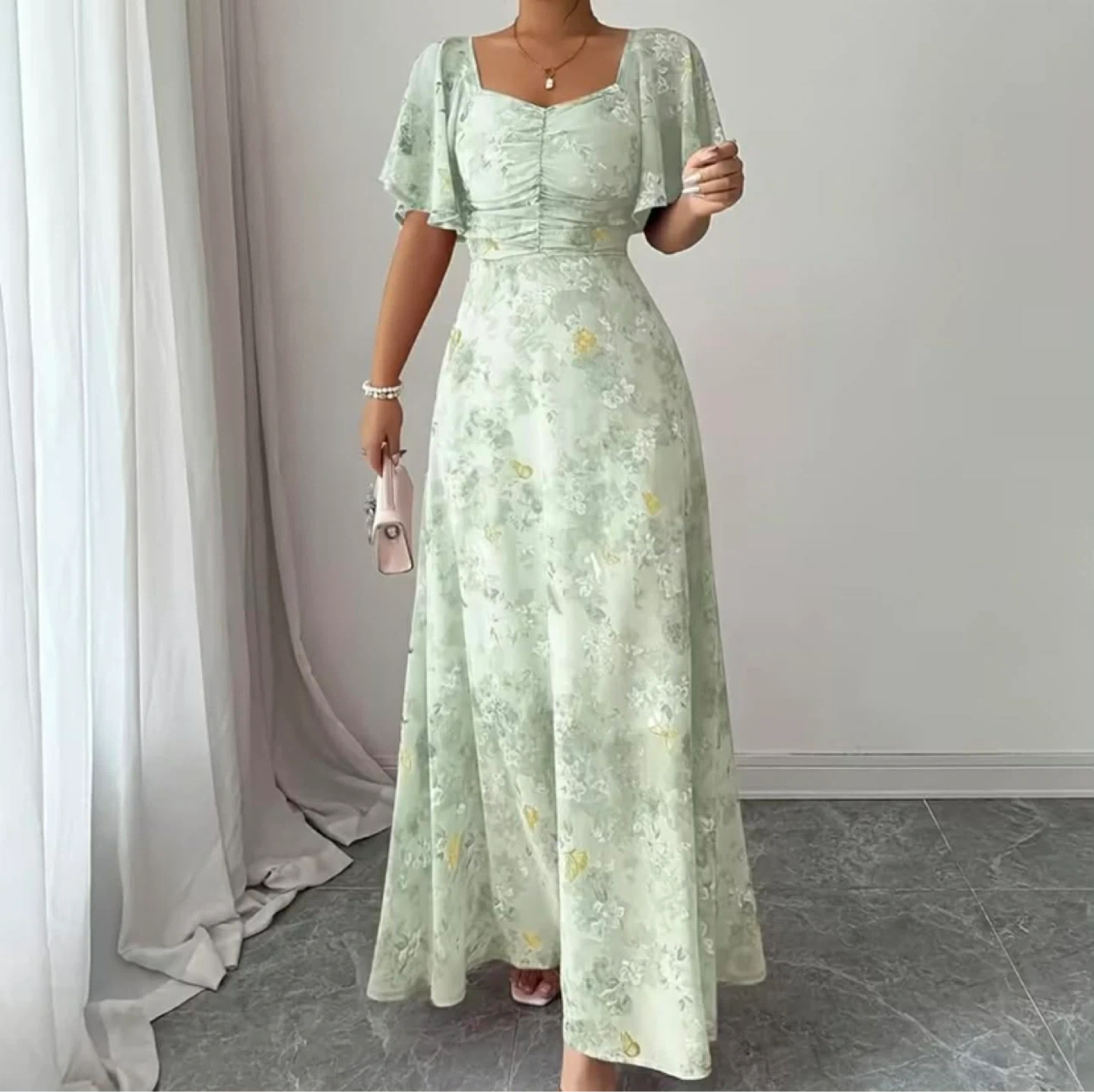 Light green maxi dress with a floral print. Features flutter sleeves and a ruched bodice. Made from a lightweight fabric.