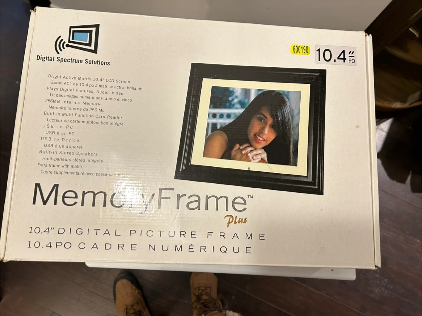 Selling a brand new MemoryFrame Plus 10.4" digital picture frame! It has a bright active matrix 10.4" LCD screen and 256MB internal memory. It also has built-in stereo speakers and a multi-function card reader. The box is included, along with the necessary components and accessories