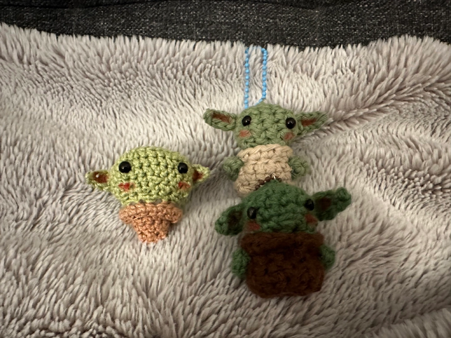 Three adorable crocheted Grogu keychains. Perfect for Star Wars fans. Two light green, one darker green. Small and cute. Makes a great gift.