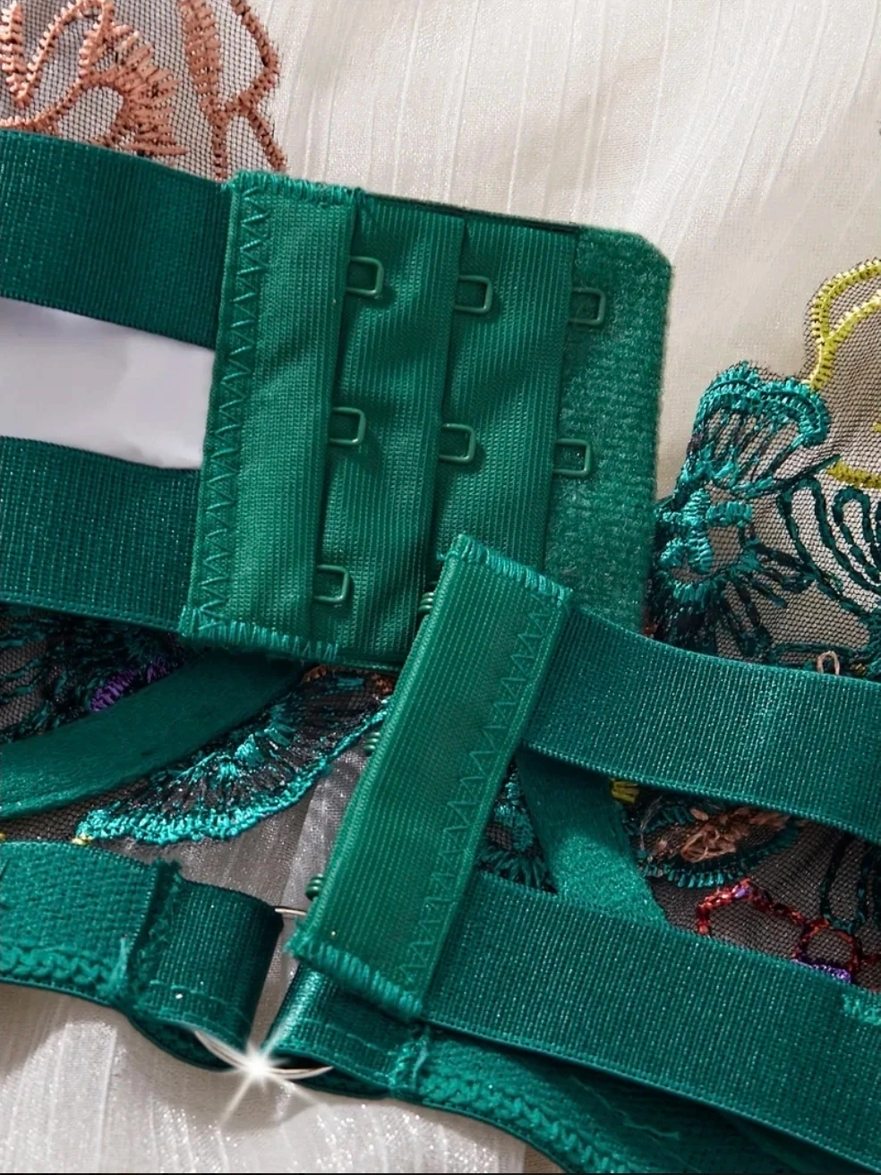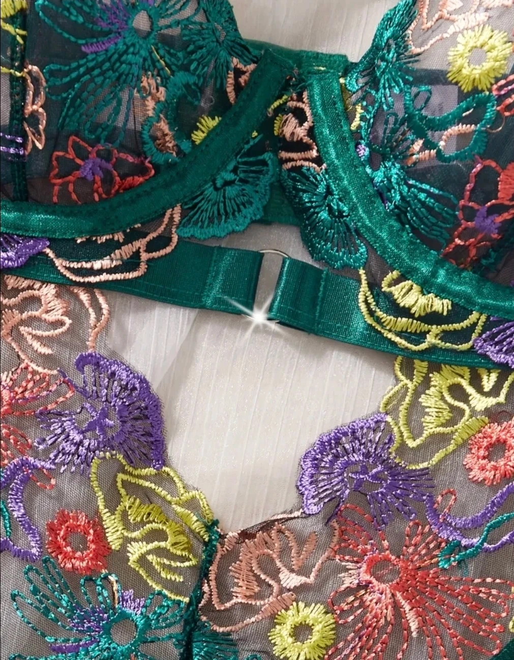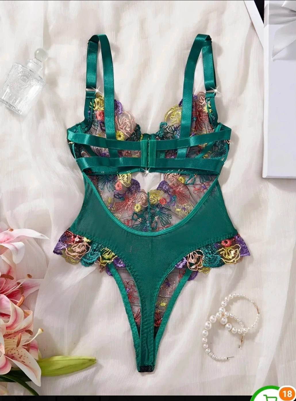 This emerald green bodysuit features intricate floral embroidery throughout. It's made of sheer mesh with adjustable straps and a hook-and-eye closure at the back. The scalloped lace trim adds a delicate touch.