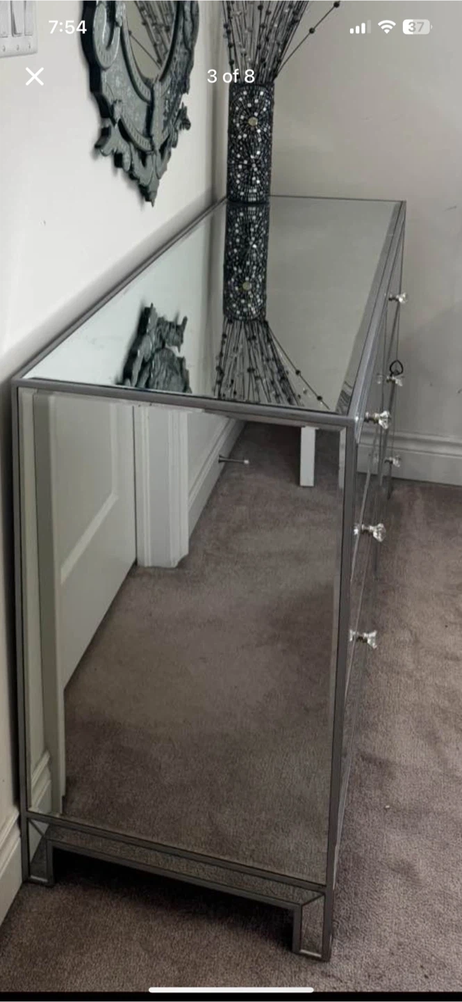 This mirrored dresser features a sleek design with crystal-like drawer knobs. It has a combination of wider and narrower drawers for varied storage needs. A stylish piece for any bedroom!