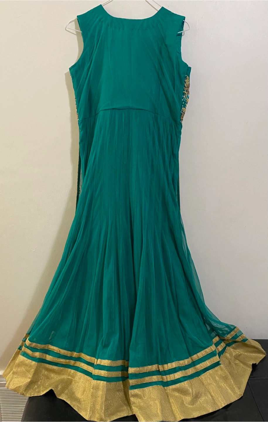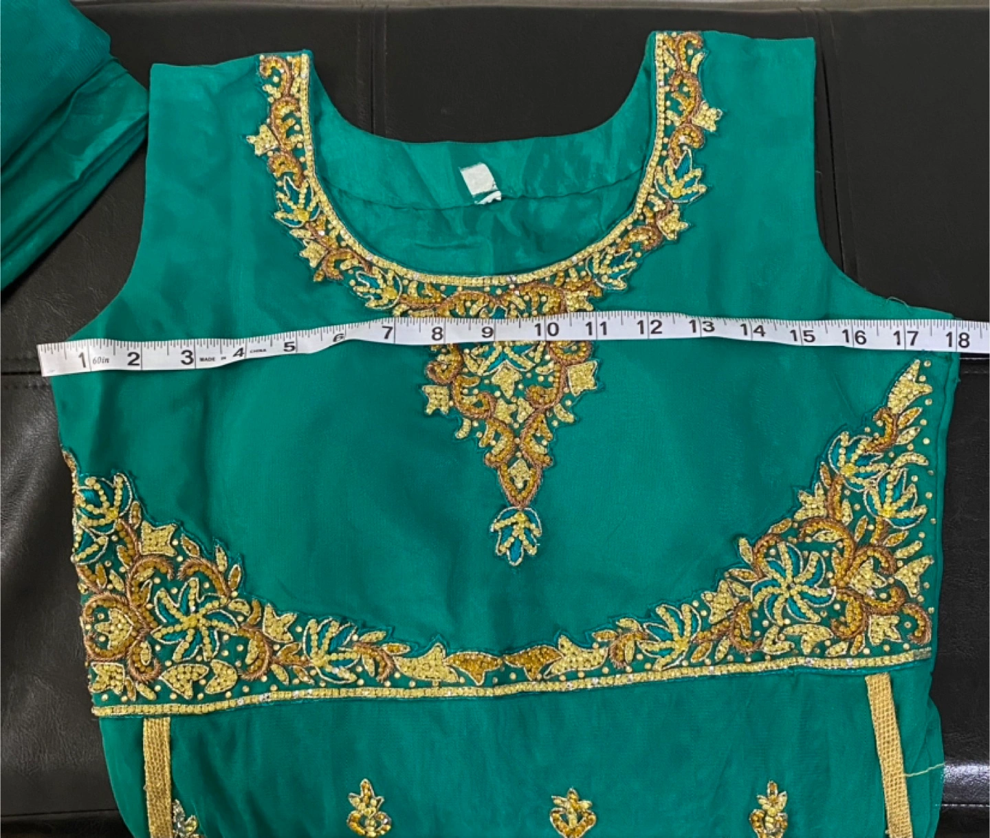 Beautiful green dress with gold embroidery! The chest measures about 17 inches across, and the length is approximately 53 inches. The dress is sleeve-less. It's in great condition.