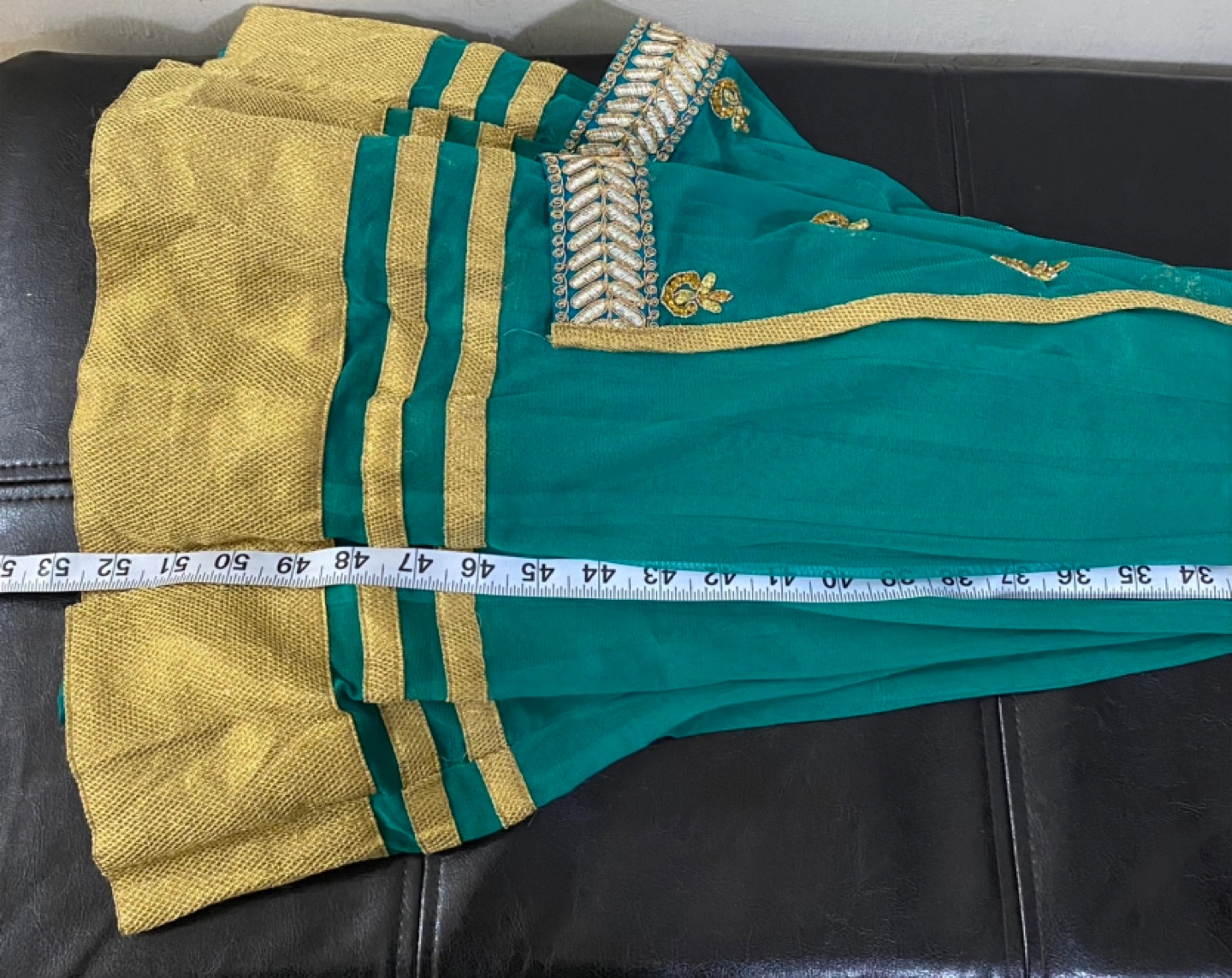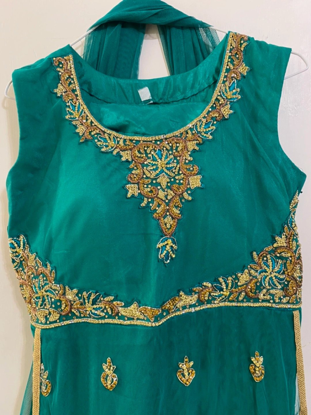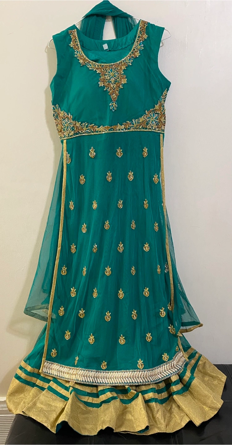 Beautiful green dress with gold embroidery! The chest measures about 17 inches across, and the length is approximately 53 inches. The dress is sleeve-less. It's in great condition.