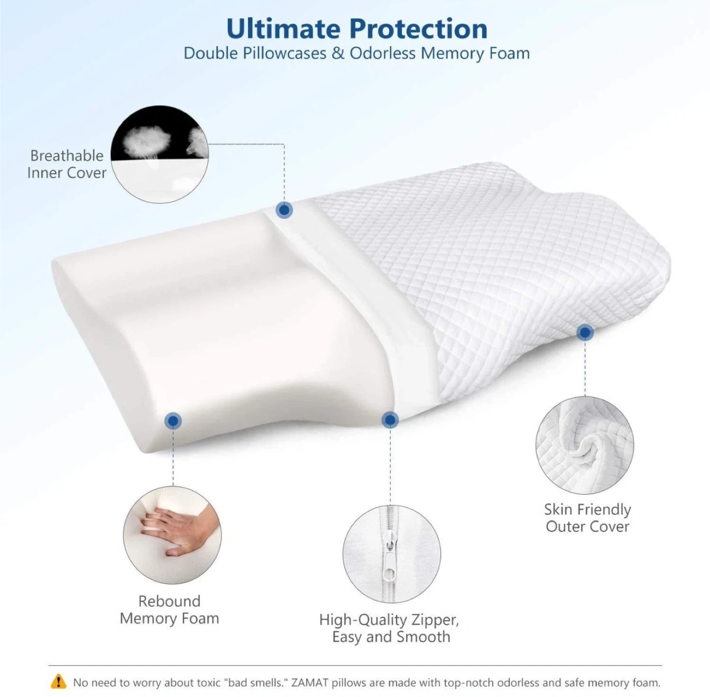 Made with high-quality, odorless CertiPUR-US certified memory foam, the pillow is hypoallergenic, breathable, and safe for sensitive sleepers. The double-layer pillowcase is soft, breathable, and removable for machine washing, helping you stay cool and comfortable throughout the night.