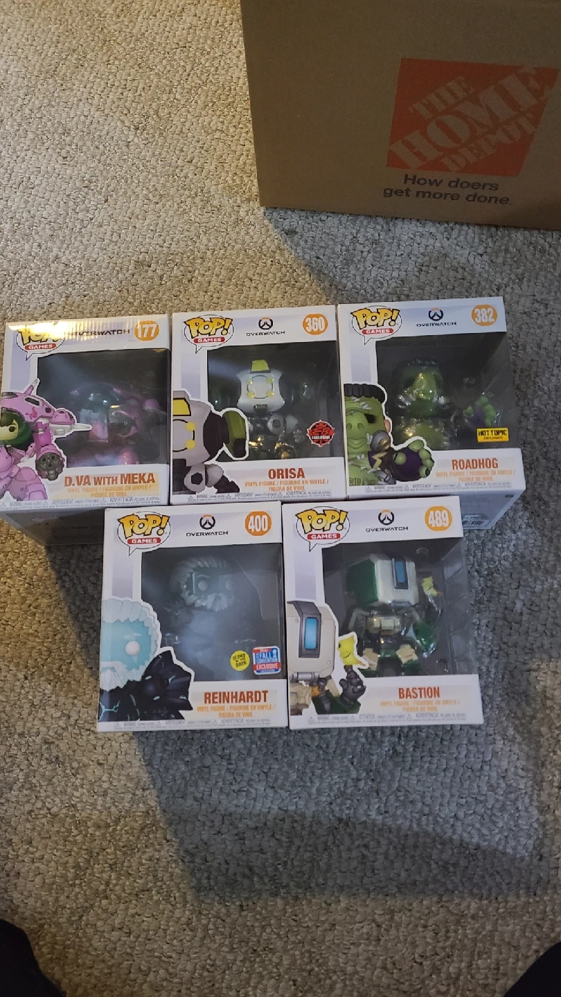 Selling a collection of Overwatch Funko Pop figures! Includes D.Va with Meka (177), Orisa (360), Roadhog (382), Reinhardt (400), and Bastion (489)