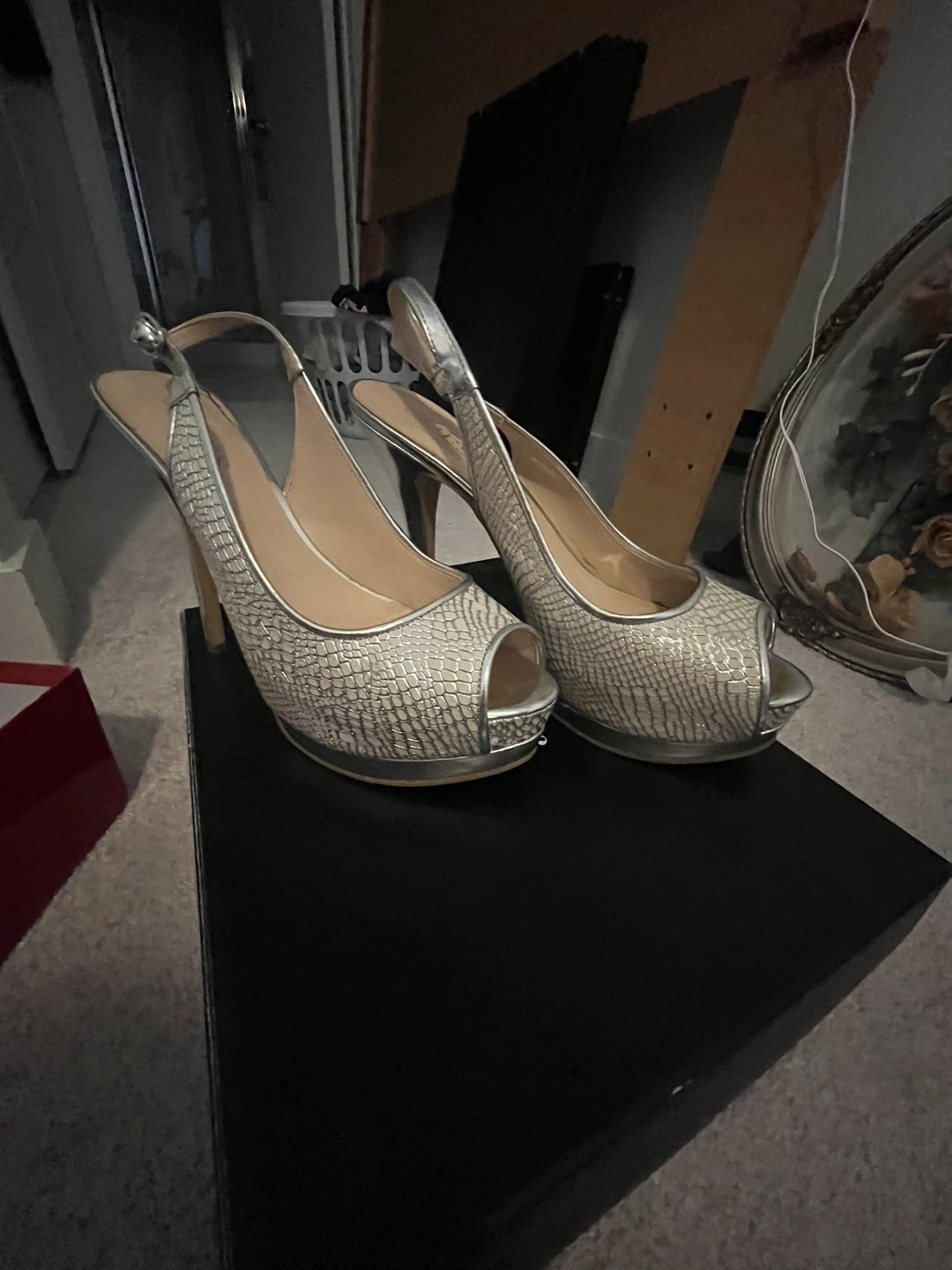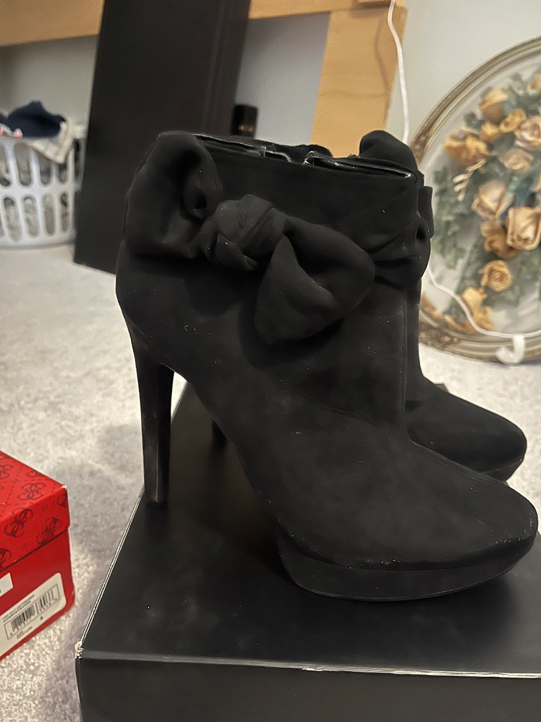 Guess silver peep toe sling back size 8 heels are a great option for dressing up any outfit. They feature a slingback strap with a buckle closure, and have a high heel. Also black booties, size 9 both worn once each. Each $40.00 OBO