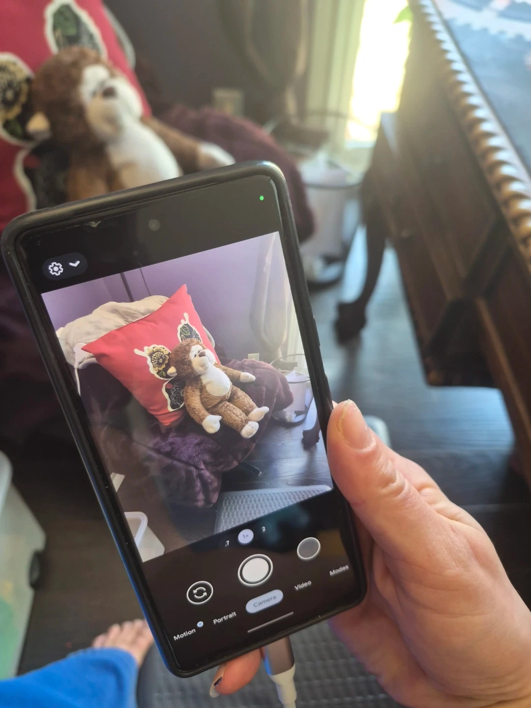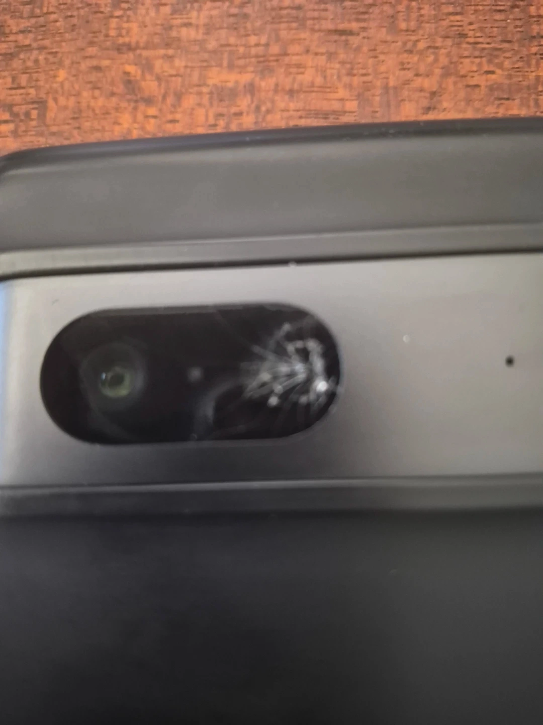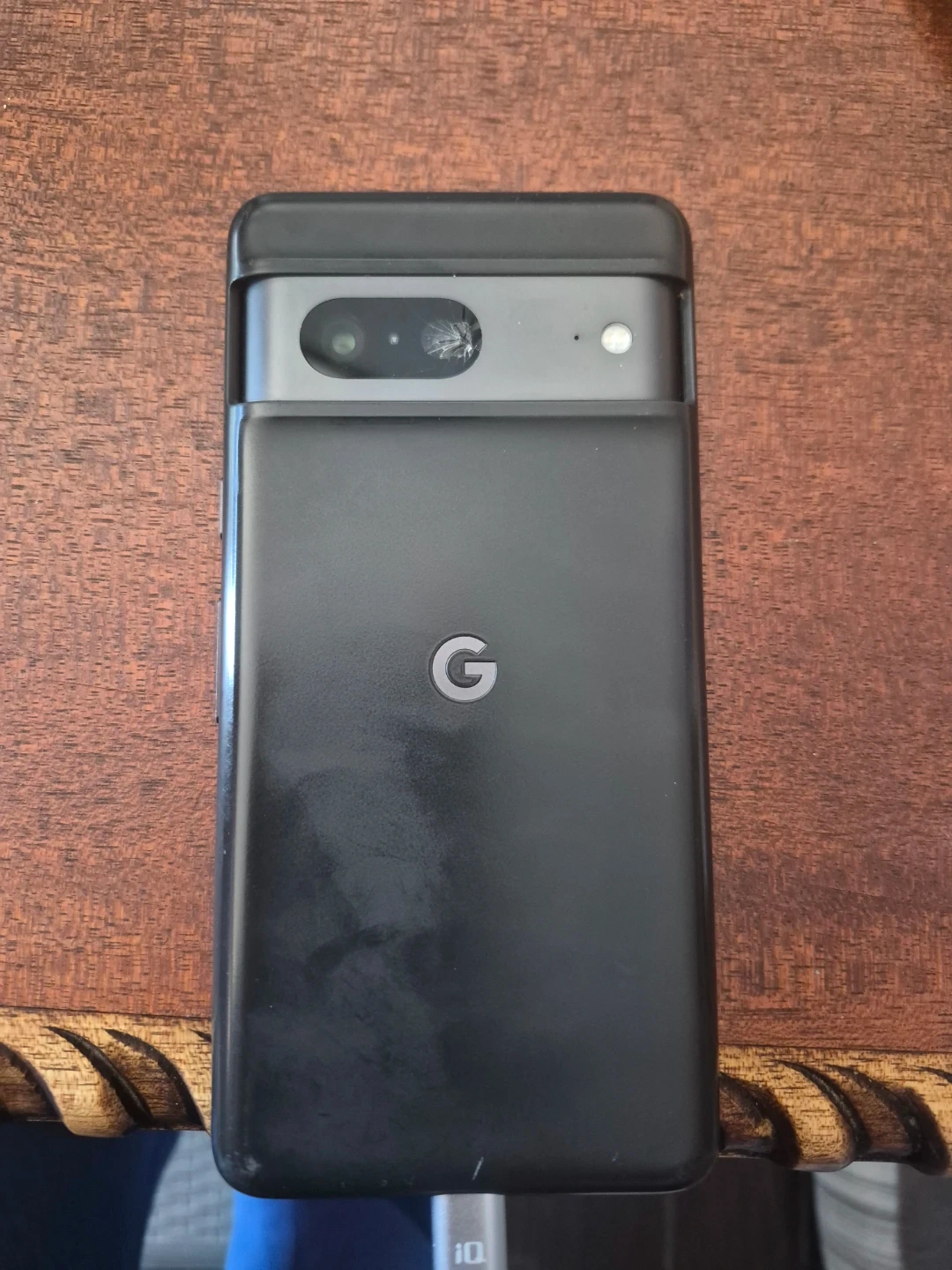 This is a Google Pixel 7 smartphone. It's in a black case but no screen protector. The back camera lens has some minor damage however it doesn't affect the picture quality!