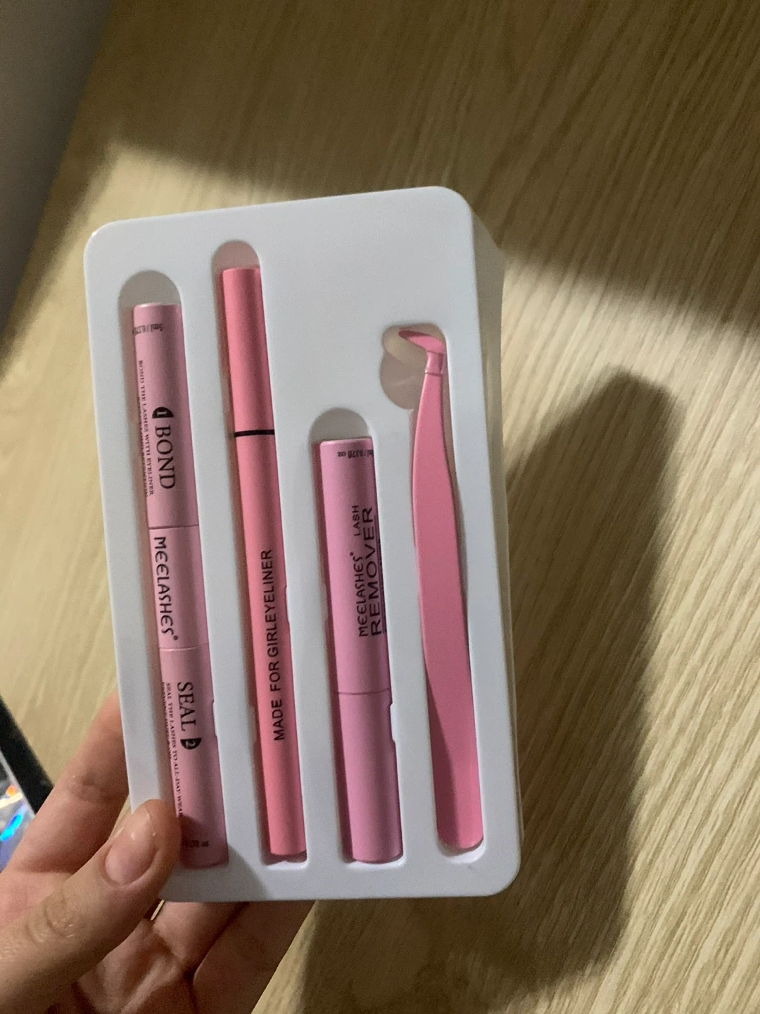 This MEELASHES kit includes magnetic eyeliner, lash remover, and tweezers. The eyeliner is designed for all-day wear and comes with a special seal. It's a convenient set for applying and removing magnetic lashes.