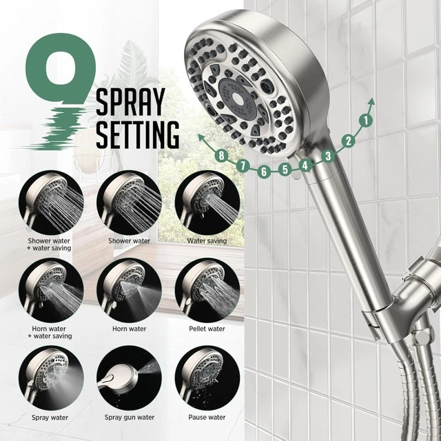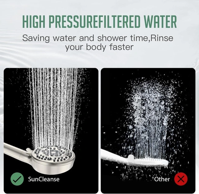 - Spray Settings: Our high pressure filtered shower head has 9 switchable settings (gun water, pellet water, shower water, water saver, flare water, spray water, flare water + water saver, shower water + water saver, pause water). Simply press the button on the back of the handheld to enter the high-pressure power rinse mode for quick rinsing of large areas. It is the best helper for cleaning bathtubs, tiles, toilets and more