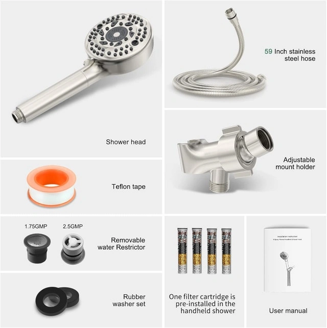 - What You Get: Water softener shower head, 4 pack replacement filters, 59 inch 304 stainless steel shower hose, 360°angle-adjustable shower holder, teflon tape, removable water restrictor, rubber washer set, user manual