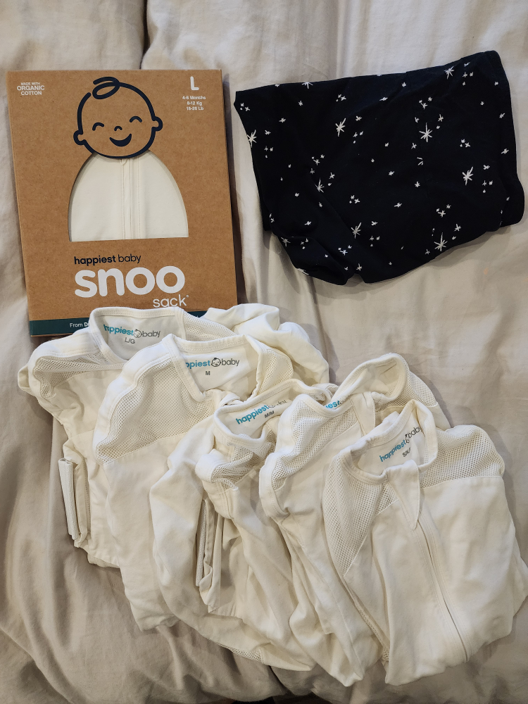 Comes with 6 swaddles and a fitted sheet. 2 x Small, 2 x Medium, 2 x Large (1 brand new).