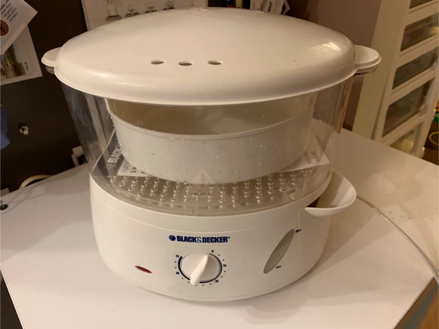 This is a Black+Decker Handy Steamer & Rice Cooker. It has two steaming bowls and a clear lid. The model number is HS1000C. It features a timer dial for easy operation.