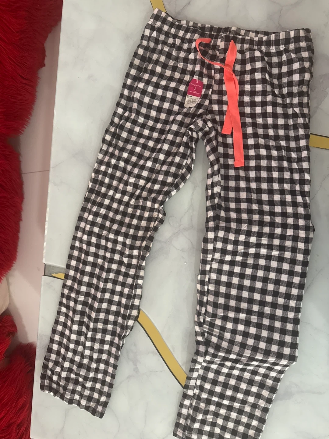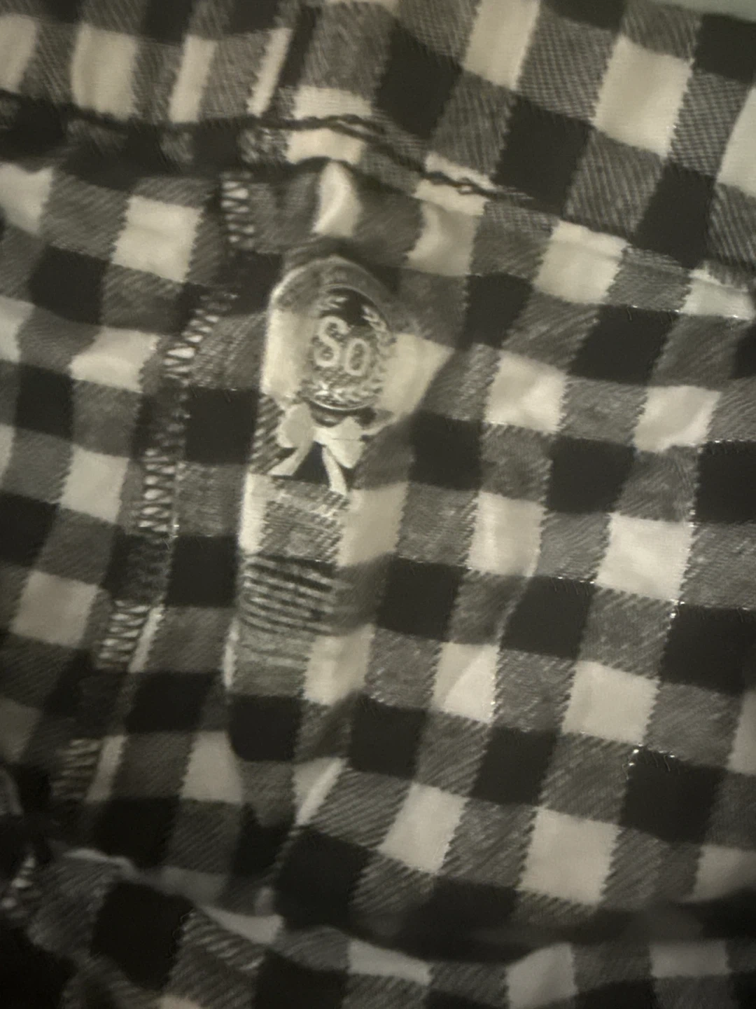 These are So by SO COMFY pajama pants. They feature a black and white gingham pattern with a drawstring waist. Size is small. Made with soft fabric for comfort!