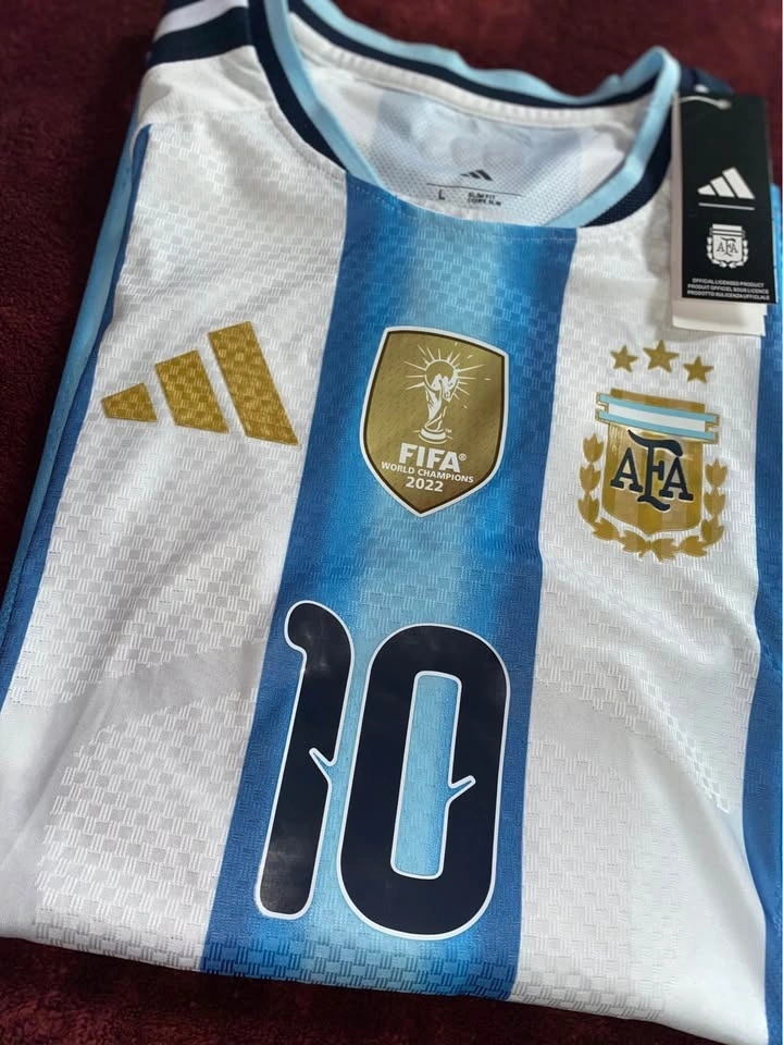 The product is a brand new 2026 Argentina soccer jersey in size small, featuring World Cup patches. This jersey represents the Argentina national team and is perfect for fans looking to show their support for the team in style. This jersey is a must-have for any soccer Fans wanting to represent their favorite team on the field or in the stands.