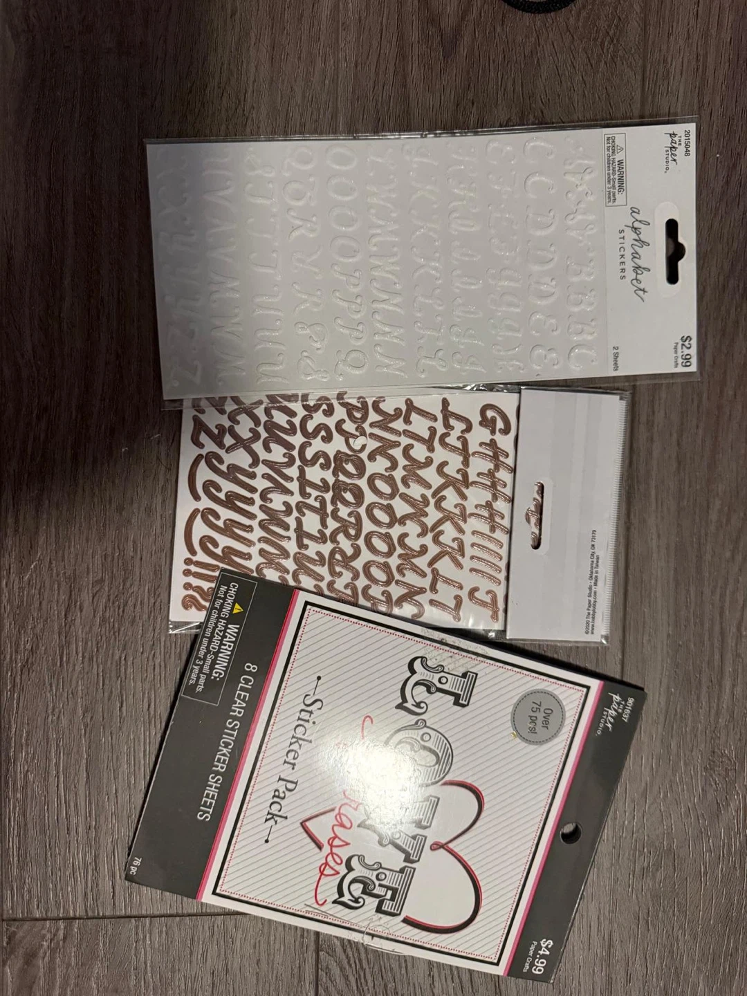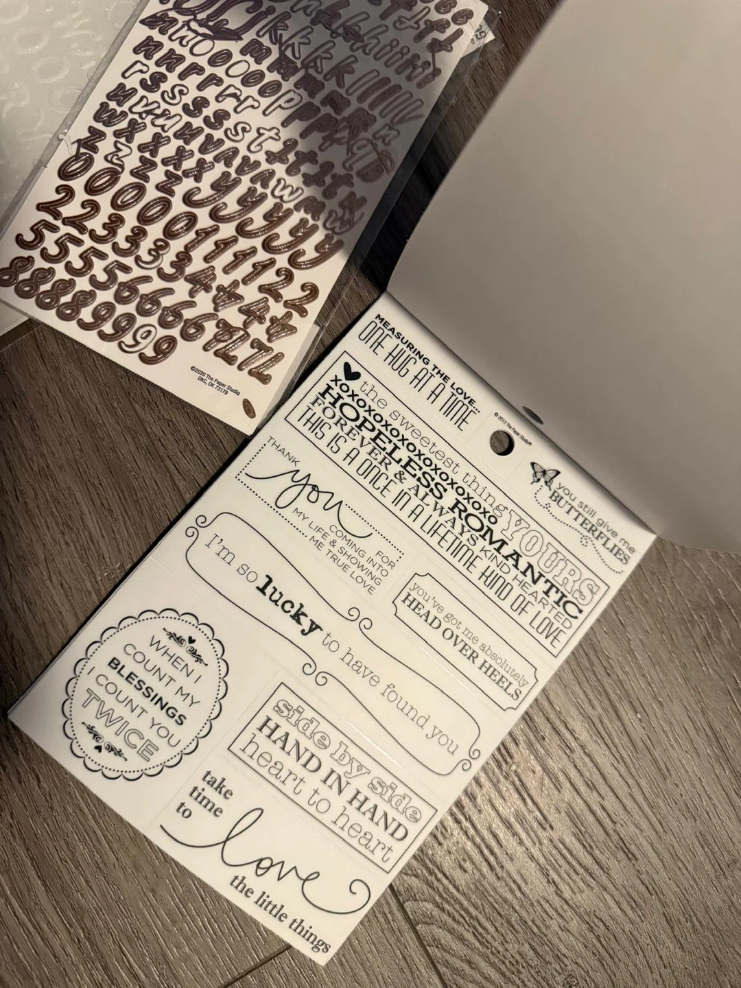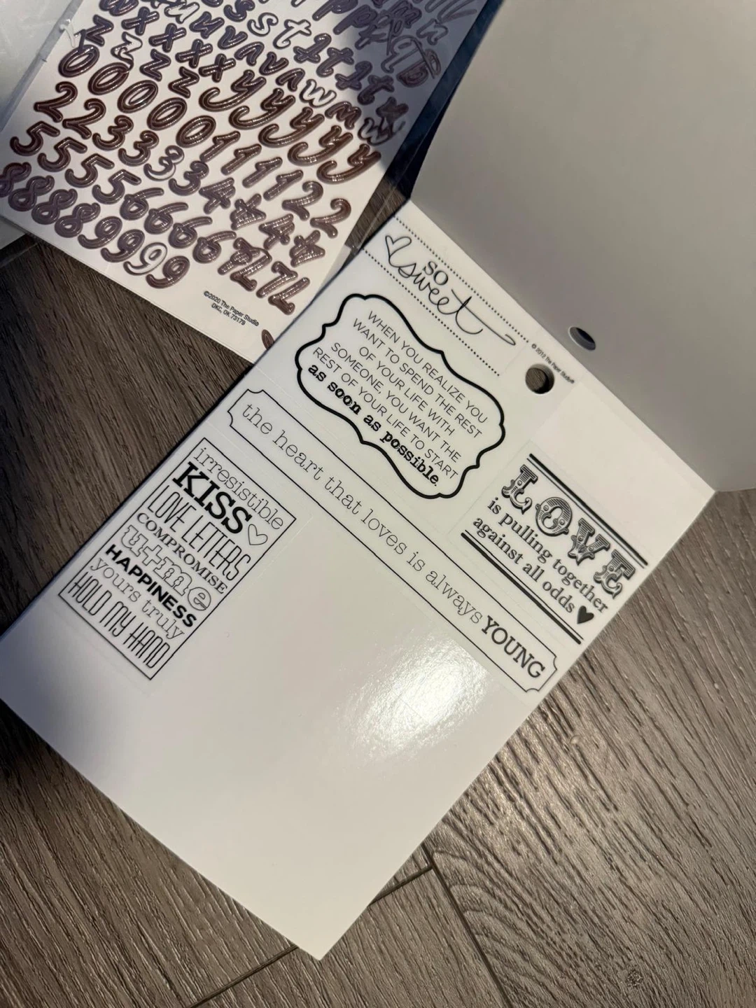 This set includes alphabet stickers in white and rose gold, plus a 'Love' themed sticker pack with various phrases and designs. Great for scrapbooking and card making!