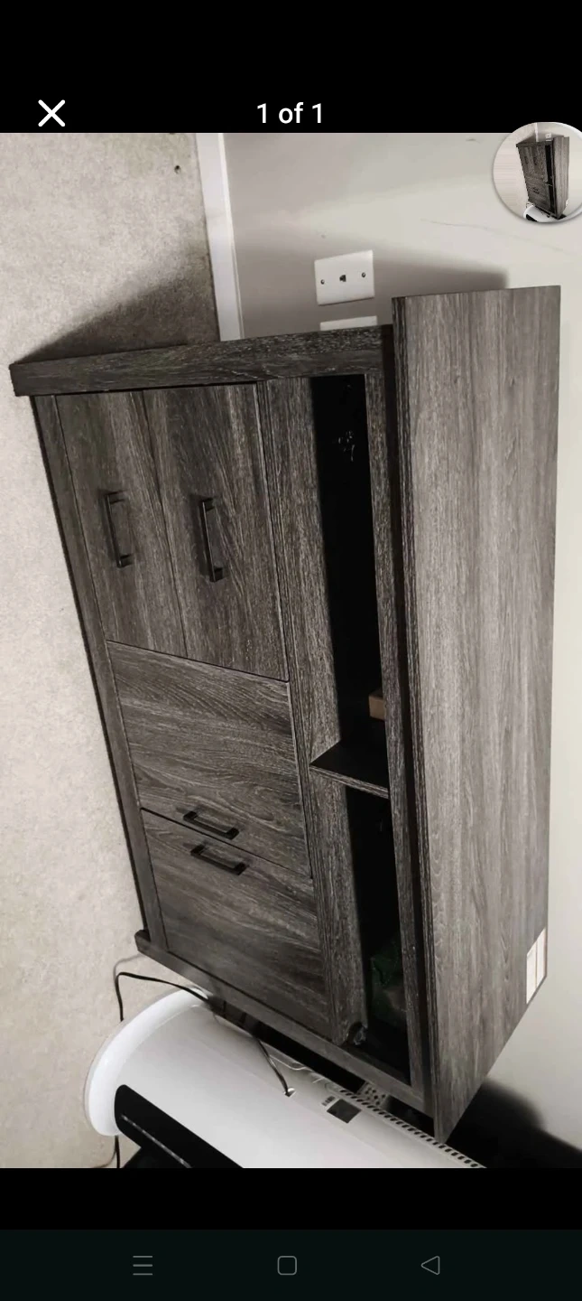 This cabinet features a wood-grain finish with two doors on top and two drawers below. It has an open shelf section on the right side. Perfect for storing various items and adding a touch of modern style to your space!