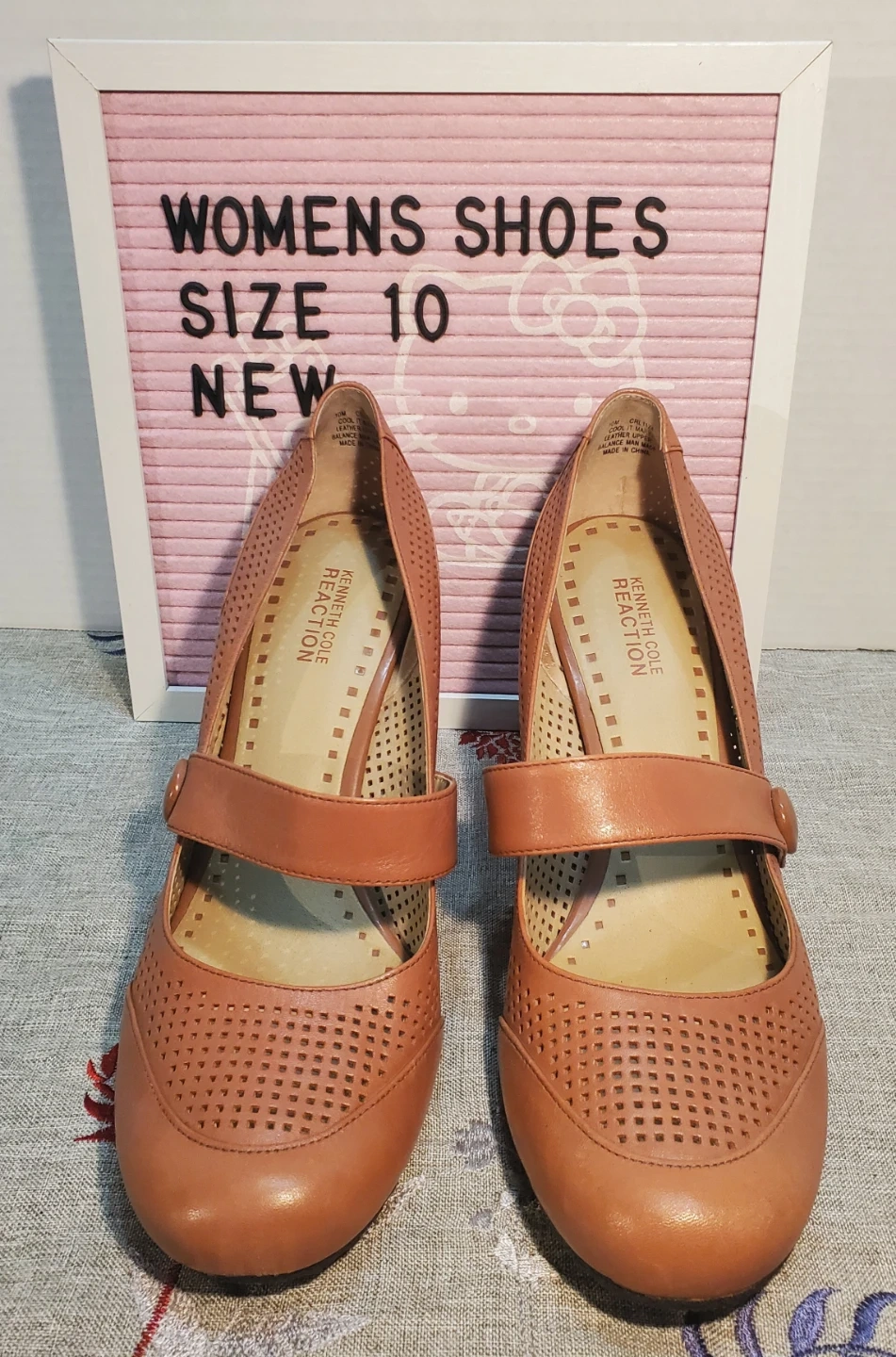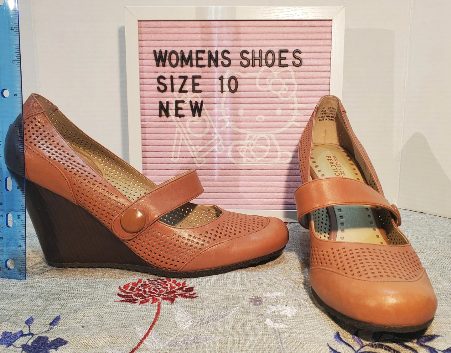 These Kenneth Cole Reaction leather wedge shoes feature a stylish perforated design. They have a comfortable adjustable strap with a button closure. Size 10.