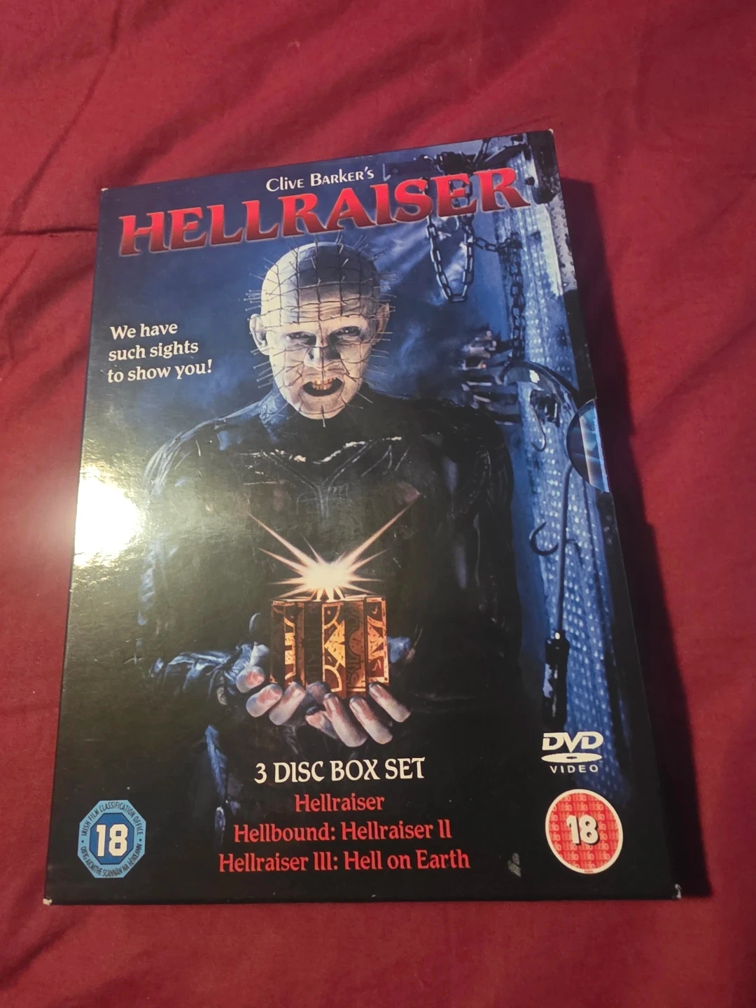 This is a 3-disc DVD box set featuring Clive Barker's Hellraiser films. It includes Hellraiser, Hellbound: Hellraiser II, and Hellraiser III: Hell on Earth. This collection is rated 18.