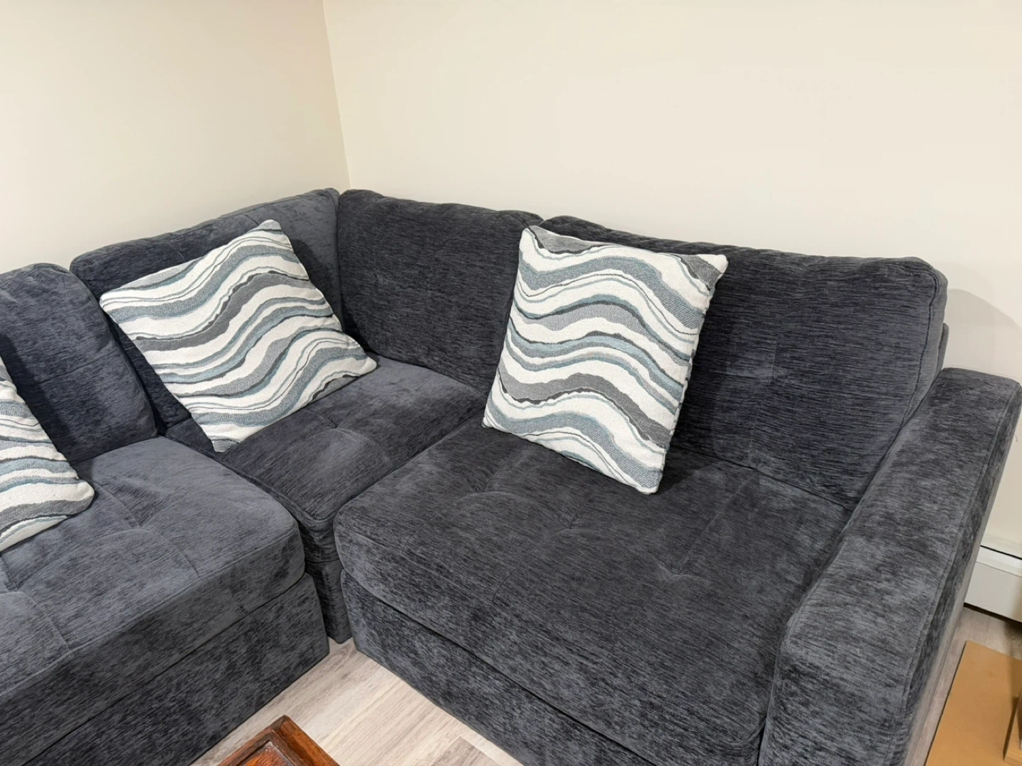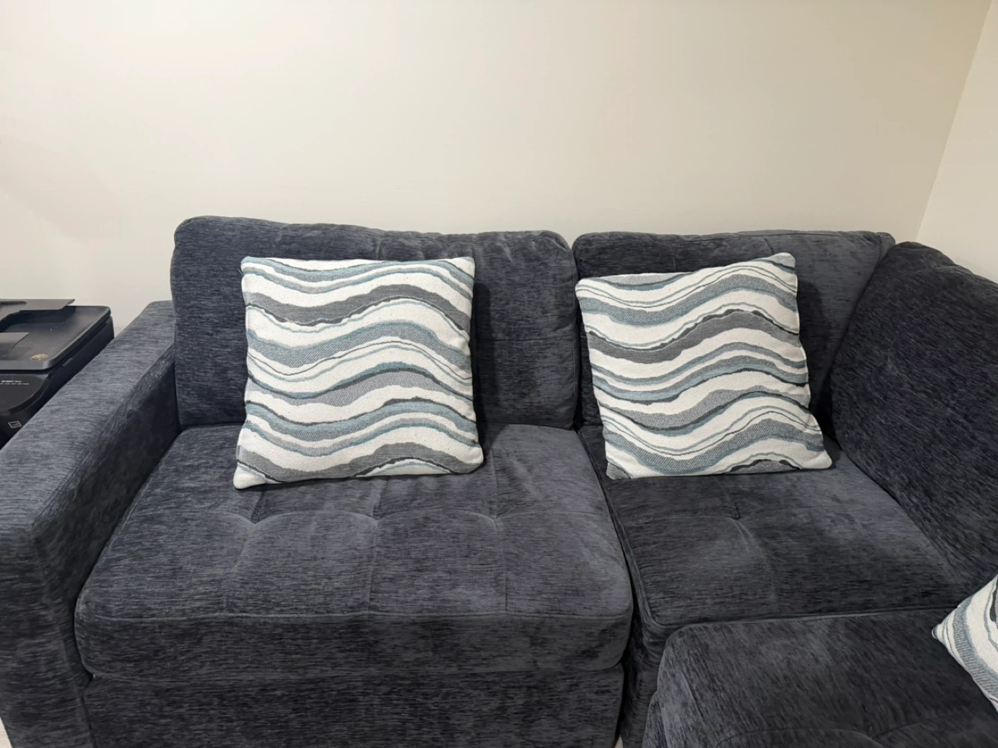 Dark gray upholstered sectional sofa. Includes 3 decorative throw pillows with a wave pattern. Good for small spaces apartment. Bought 8 mos ago.