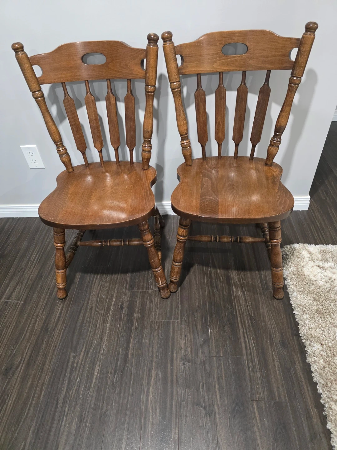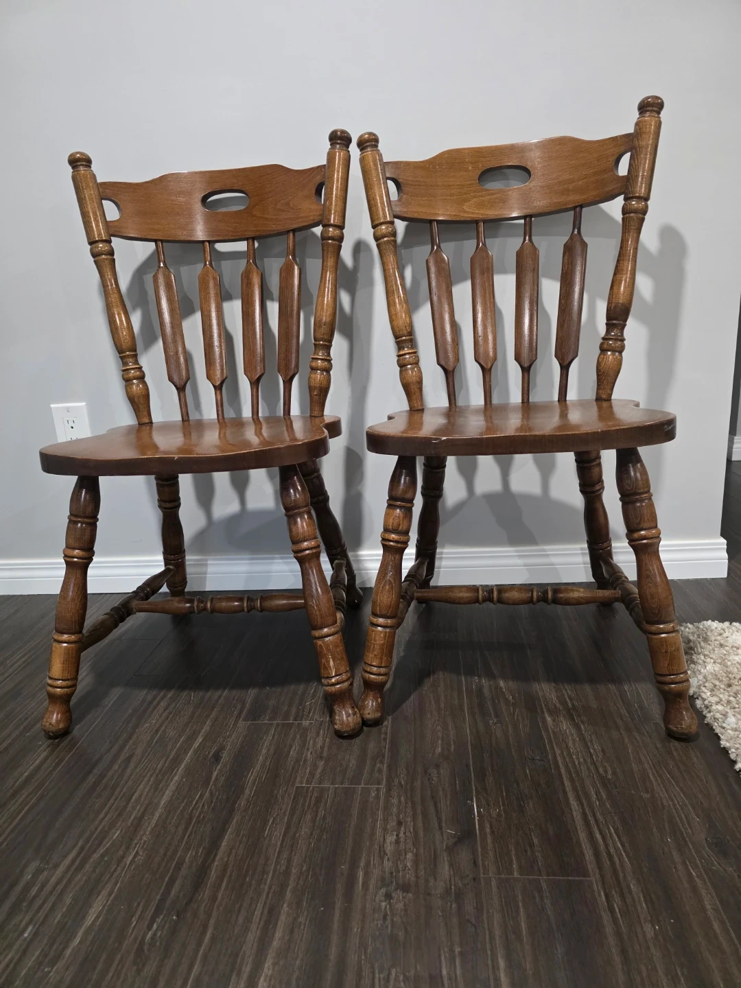 Set of two classic wooden dining chairs. Features a spindle back design with a contoured seat for comfort. Sturdy construction, perfect for your kitchen or dining area.