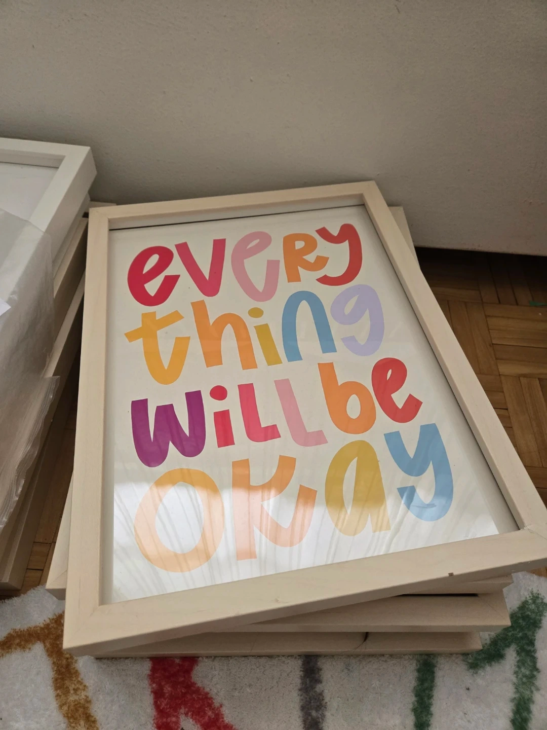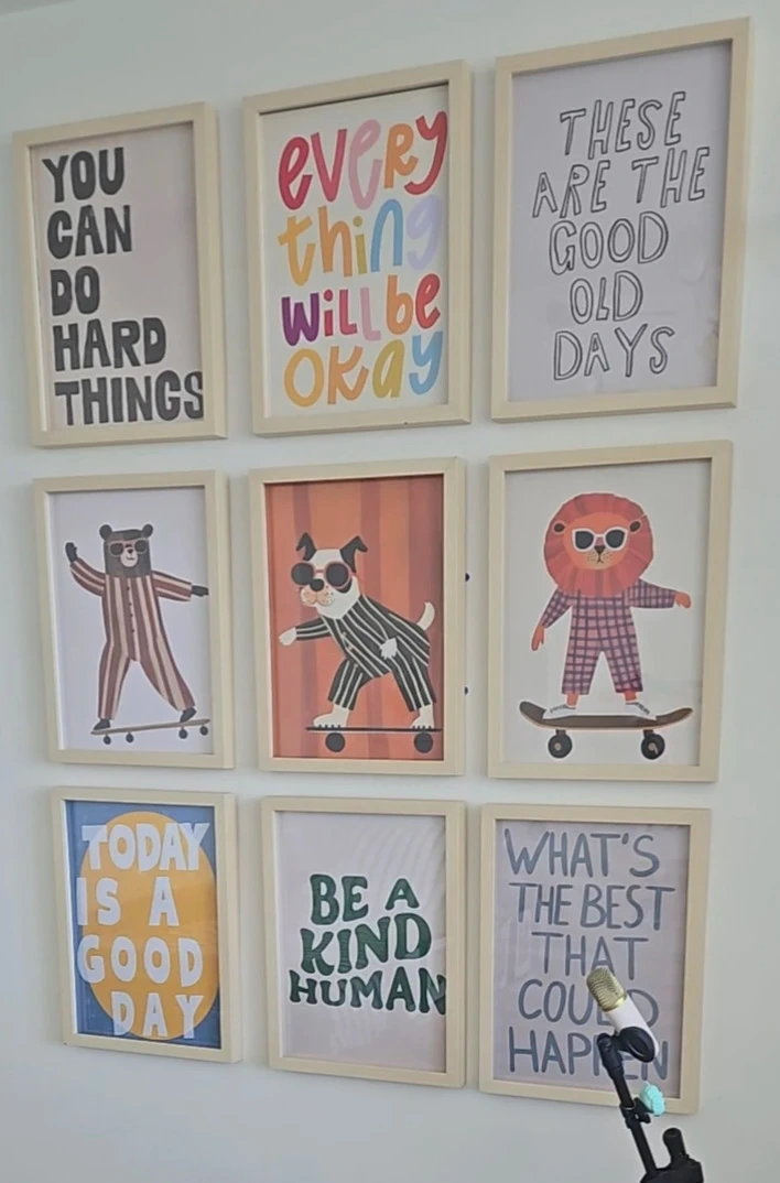 Nine framed prints with uplifting messages and cute animal illustrations, great for a kid's toom. Each print measures approximately 11x15 inches. Light wood frames included.