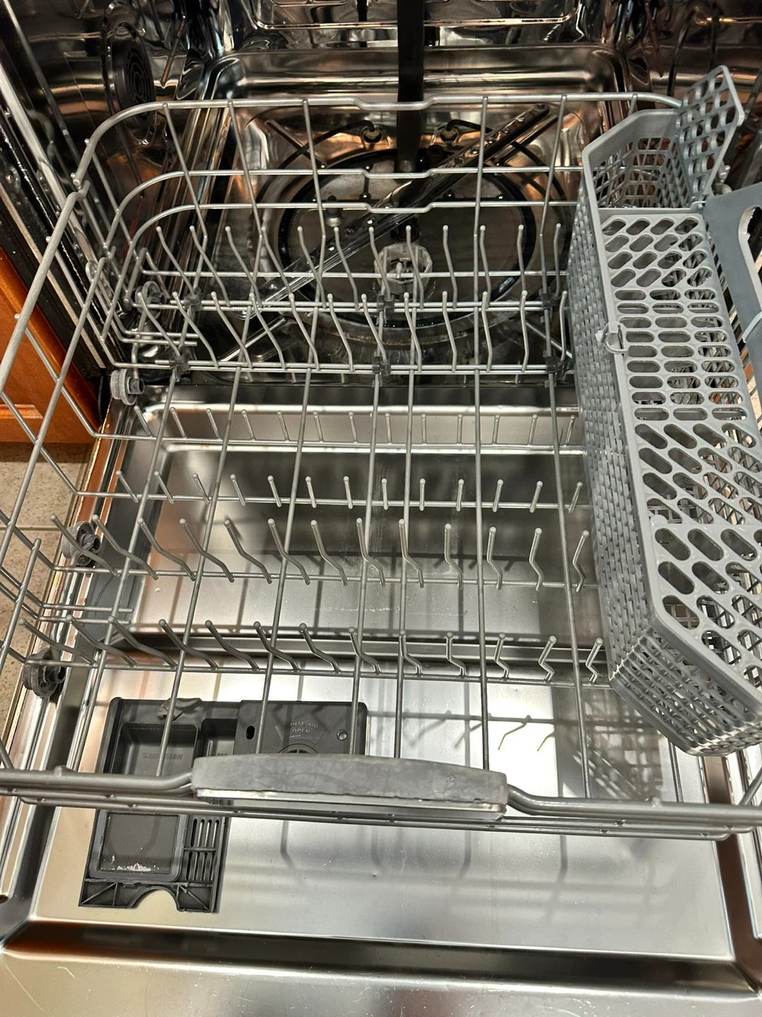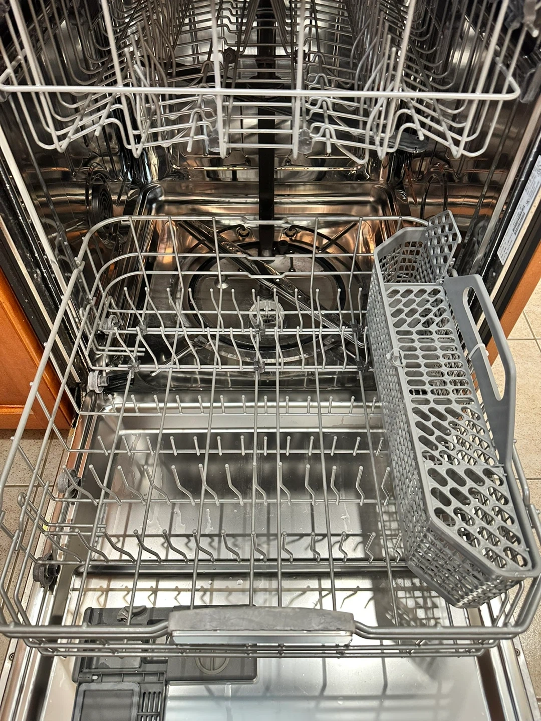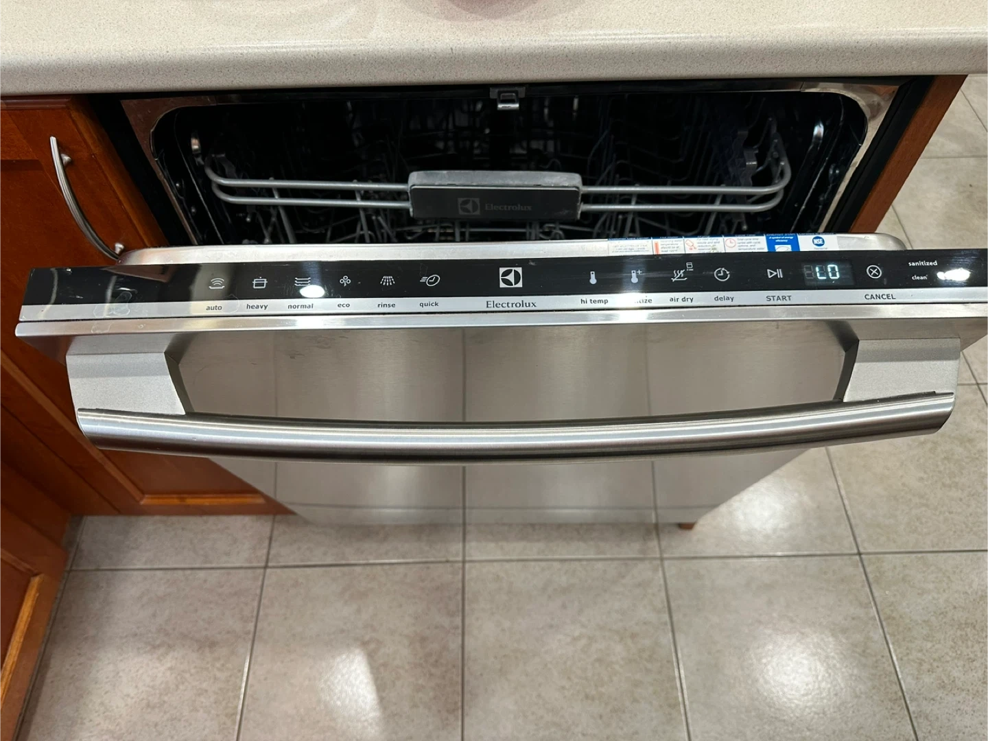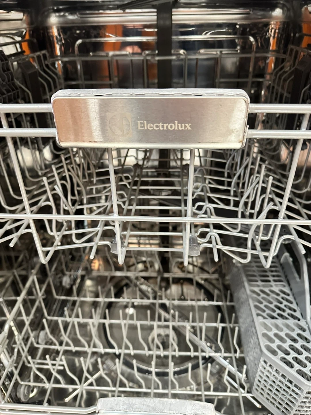 This is an Electrolux dishwasher with a stainless steel exterior and interior. It has multiple wash cycles including auto, normal, eco, sanitize, quick, rinse, air dry, and delay. It's a reliable appliance for keeping your dishes sparkling clean! In good working condition and very quiet.