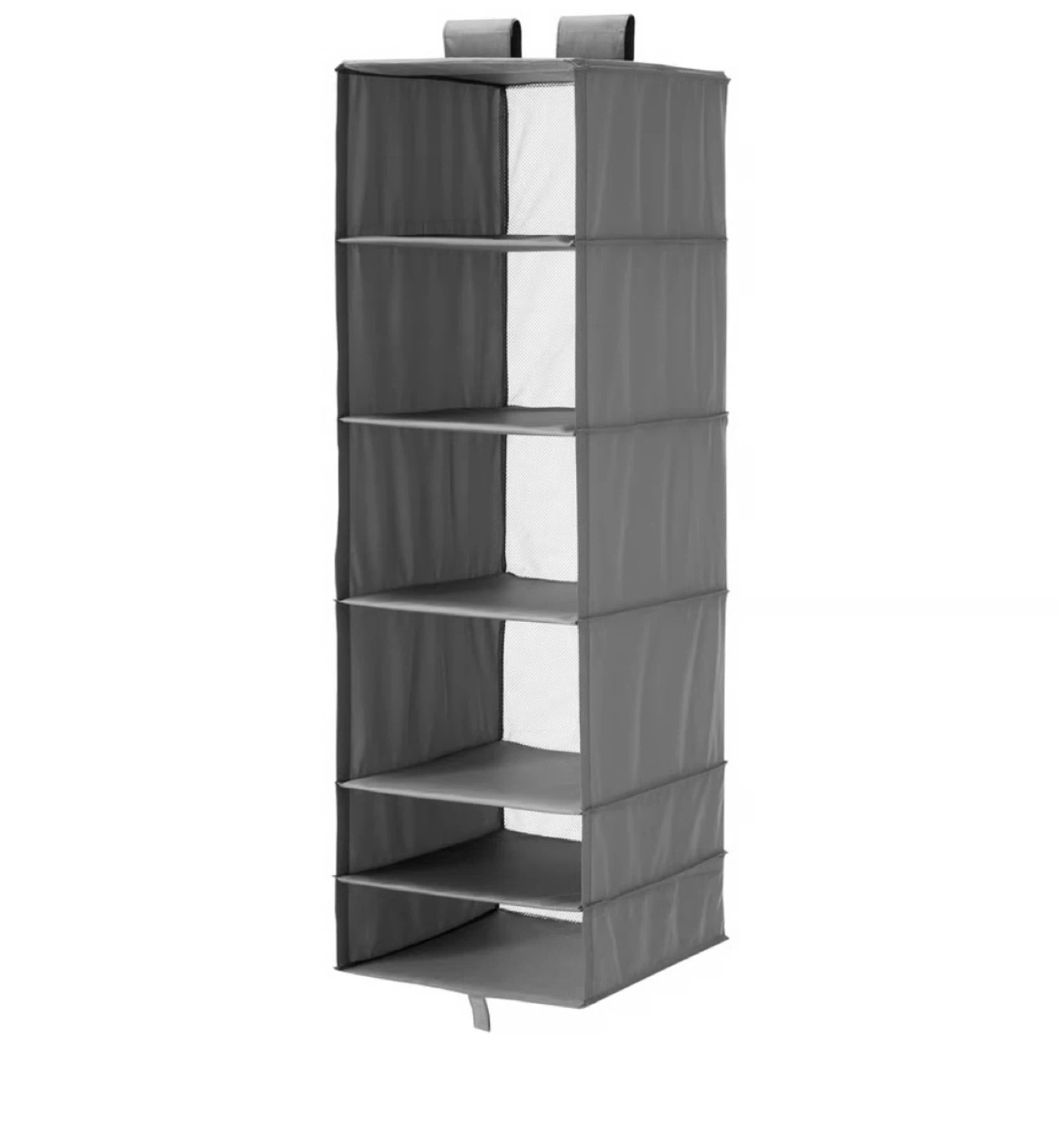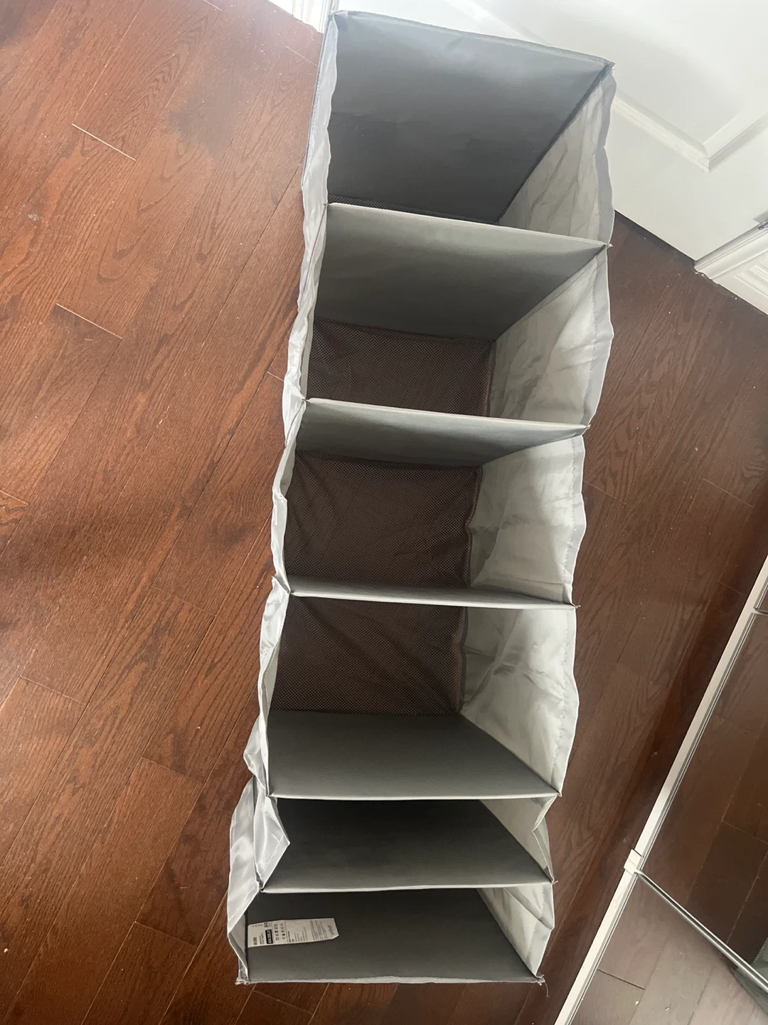 This closet organizer has six compartments for storing clothes or accessories. It's made of fabric . Great for keeping your closet tidy!