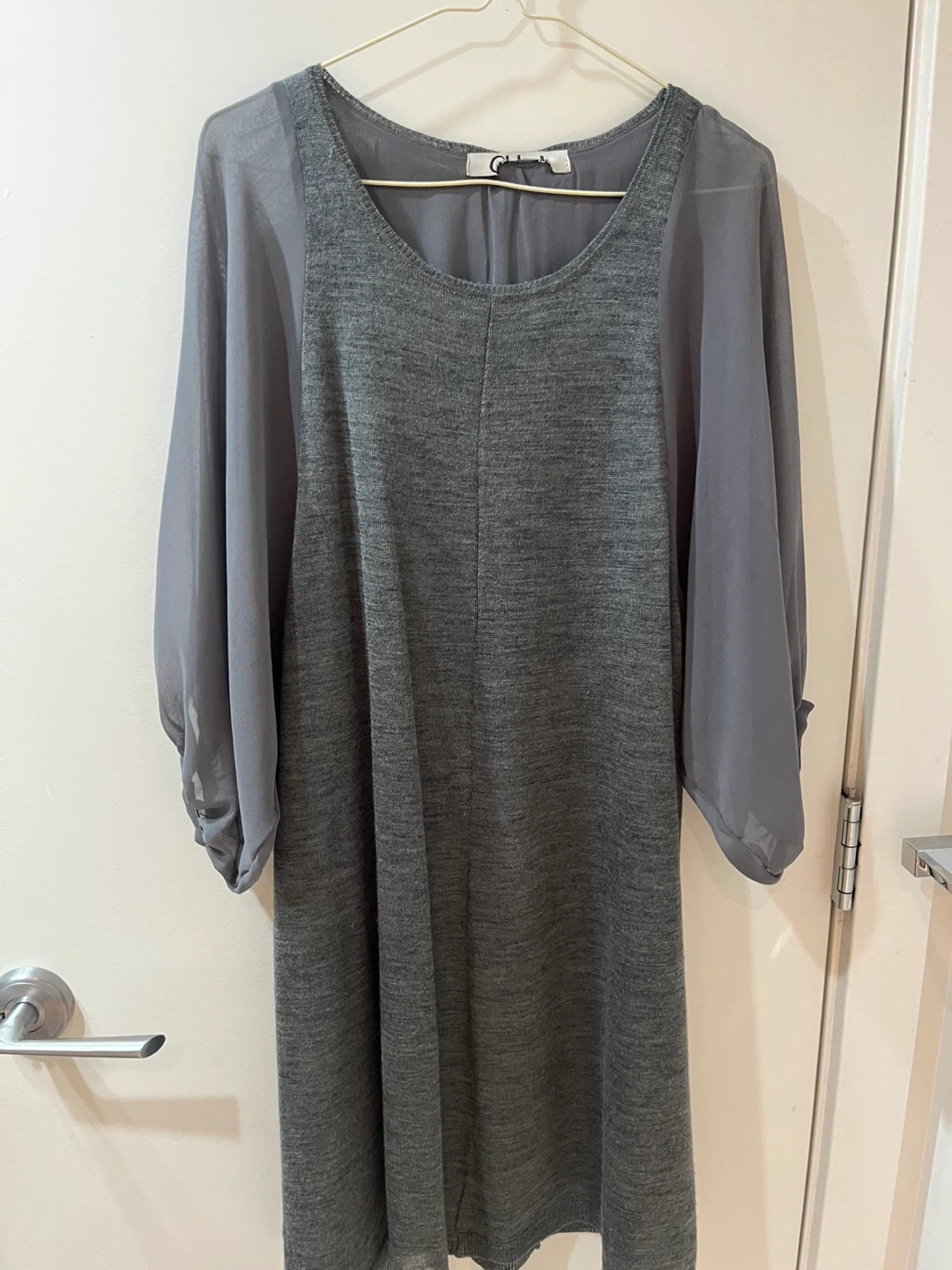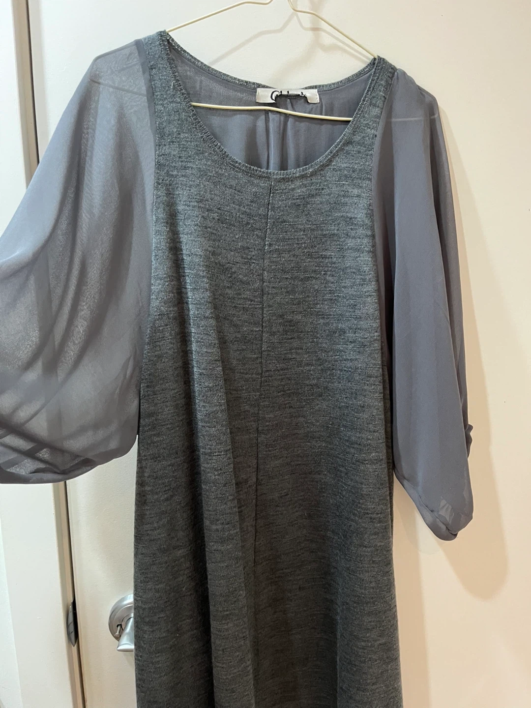Chic grey sweater dress featuring sheer, voluminous sleeves. The bodice is a knit material, offering warmth and comfort. It's a versatile piece for various occasions.