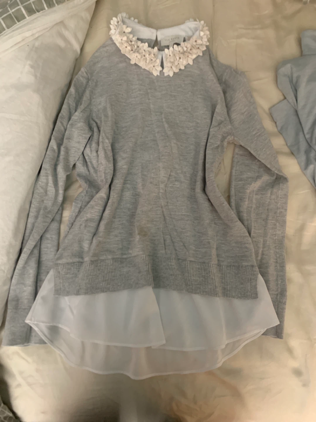 Grey long-sleeved sweater with a white layered hem. Features a decorative collar with floral embellishments. This sweater is great for layering in cooler weather.