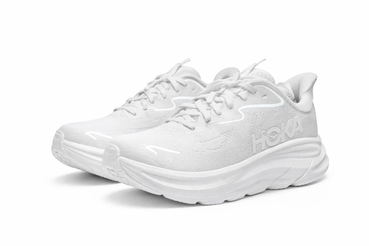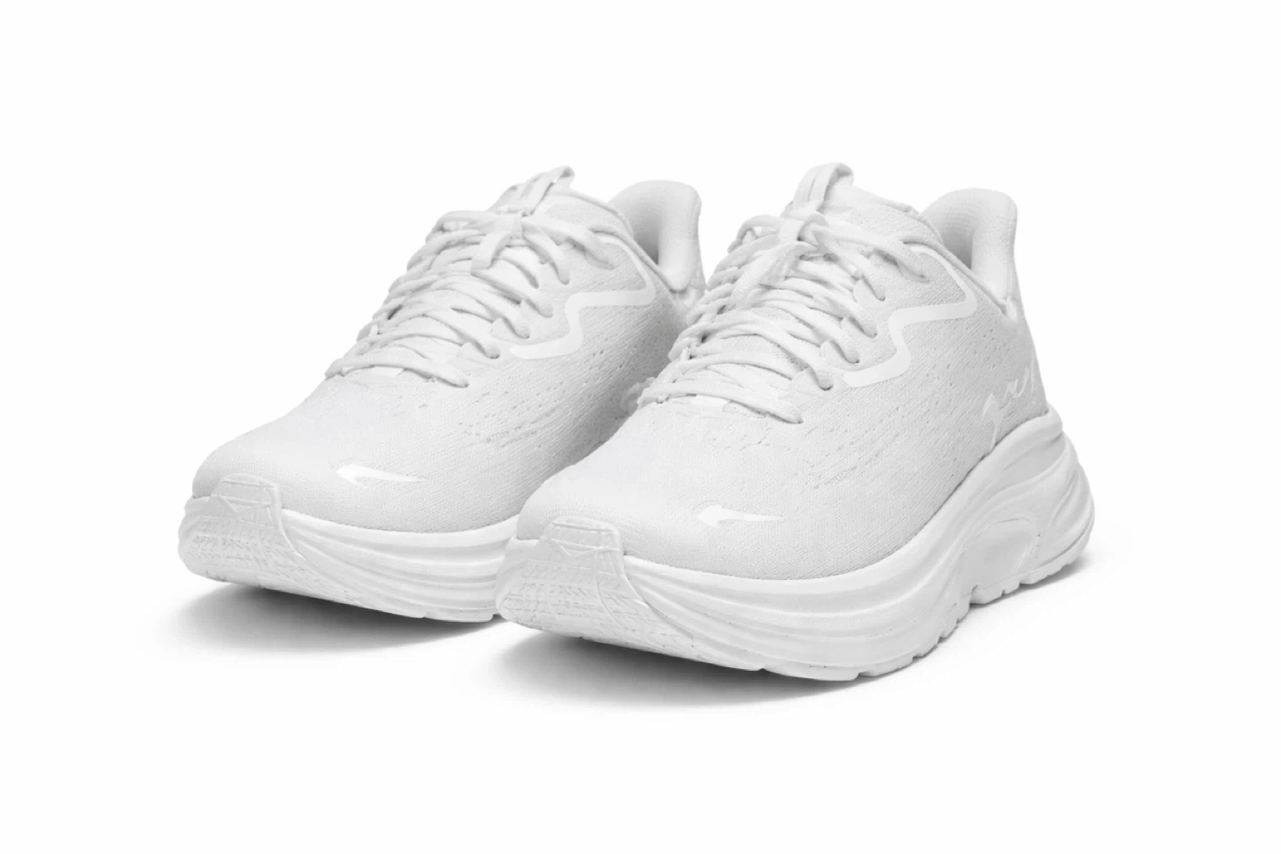 Women's Hoka Clifton 10 running shoes in white. Size 8.5B and 9B. These shoes offer maximum cushioning and a smooth ride. They're built for comfort on long runs or everyday wear. Textile and rubber construction.