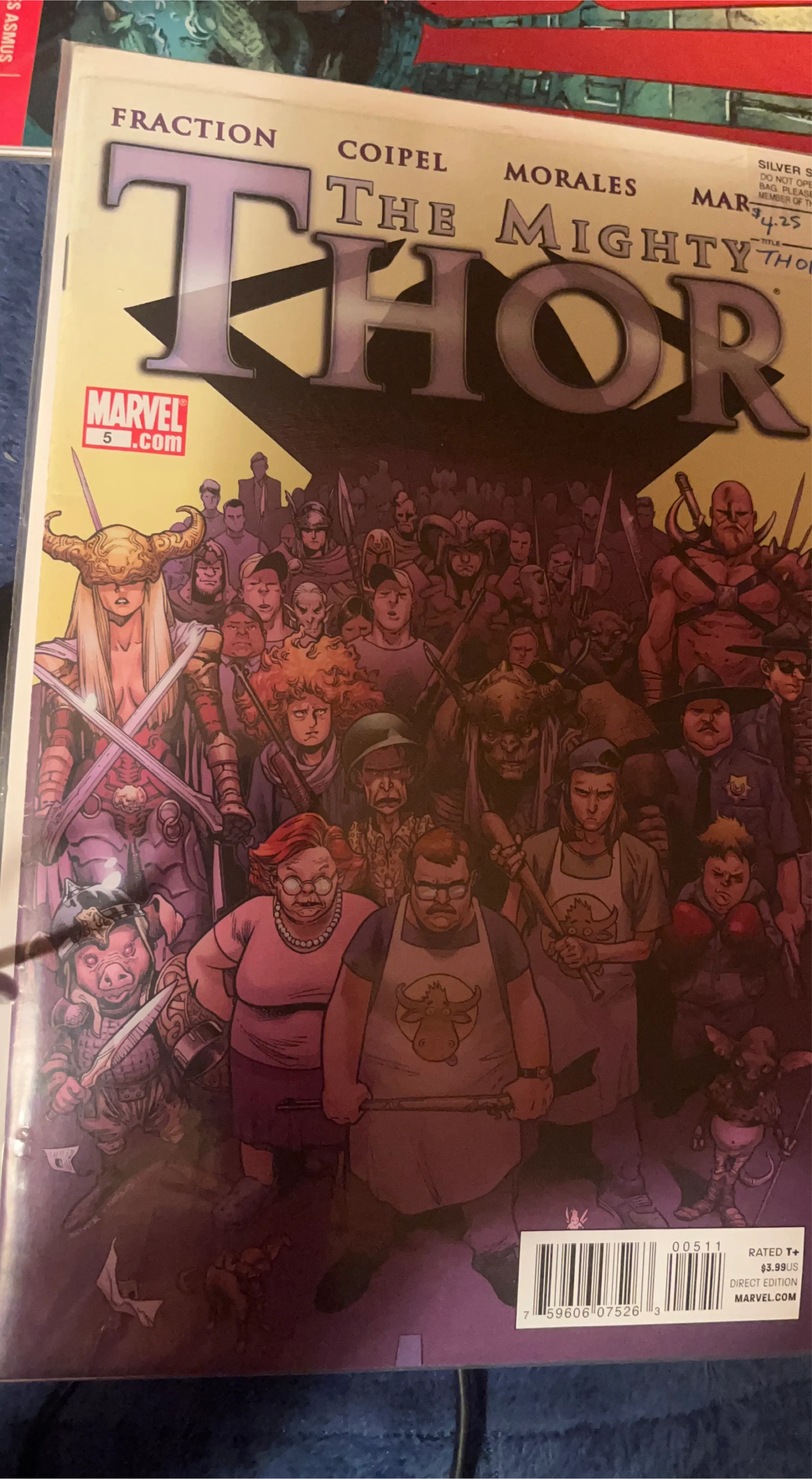 This is The Mighty Thor issue number 5, featuring work by Fraction, Coipel, and Morales. It's a direct edition from Marvel Comics. This comic is rated T+ for teens and up.