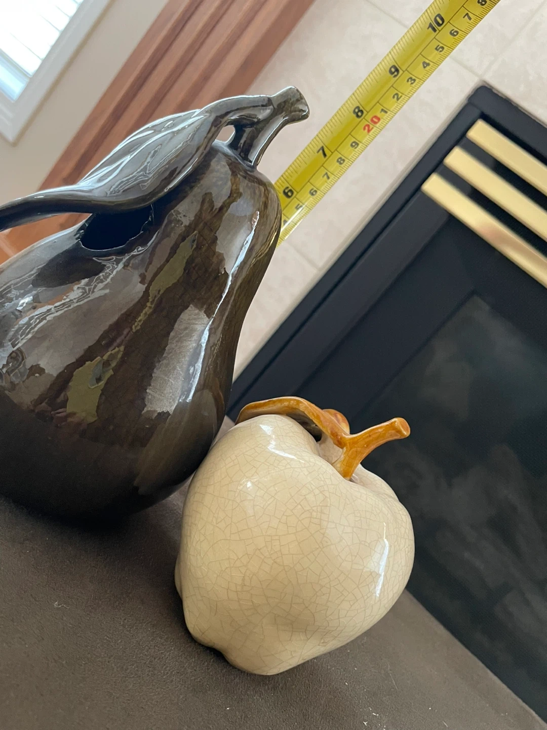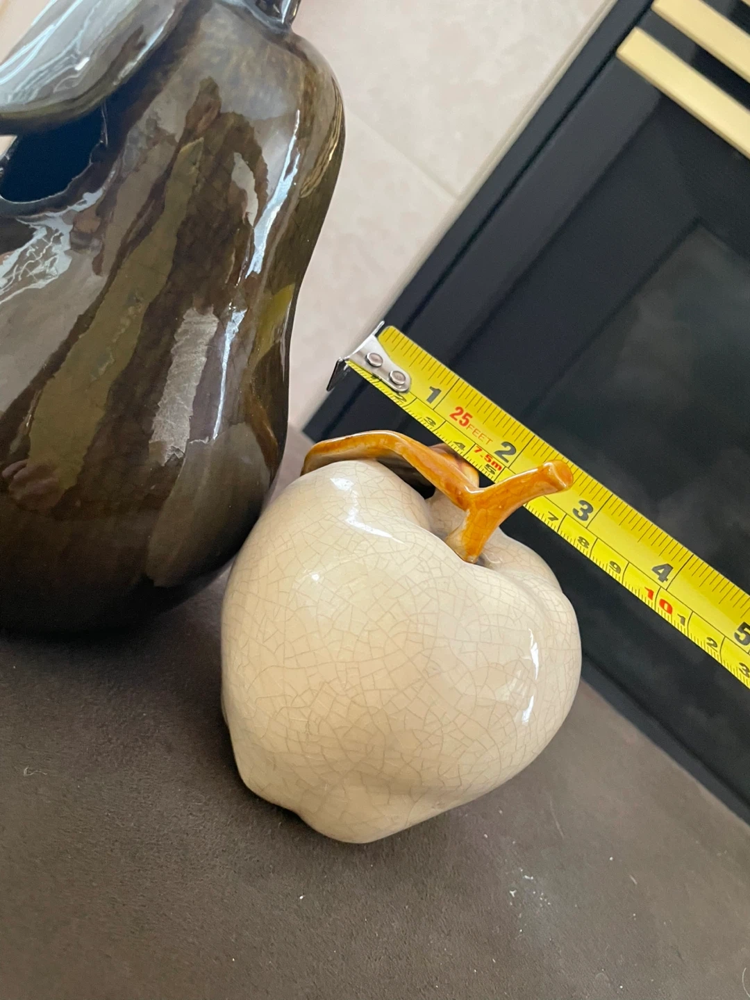 Decorative ceramic pear and apple set. The pear is dark green with a glossy finish, and the apple is cream-coloured with a crackle glaze. These pieces add a touch of seasonal charm to any tabletop.