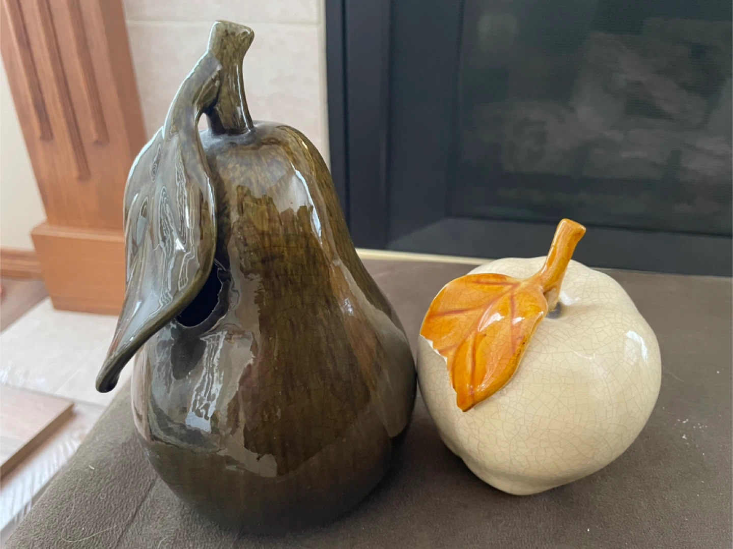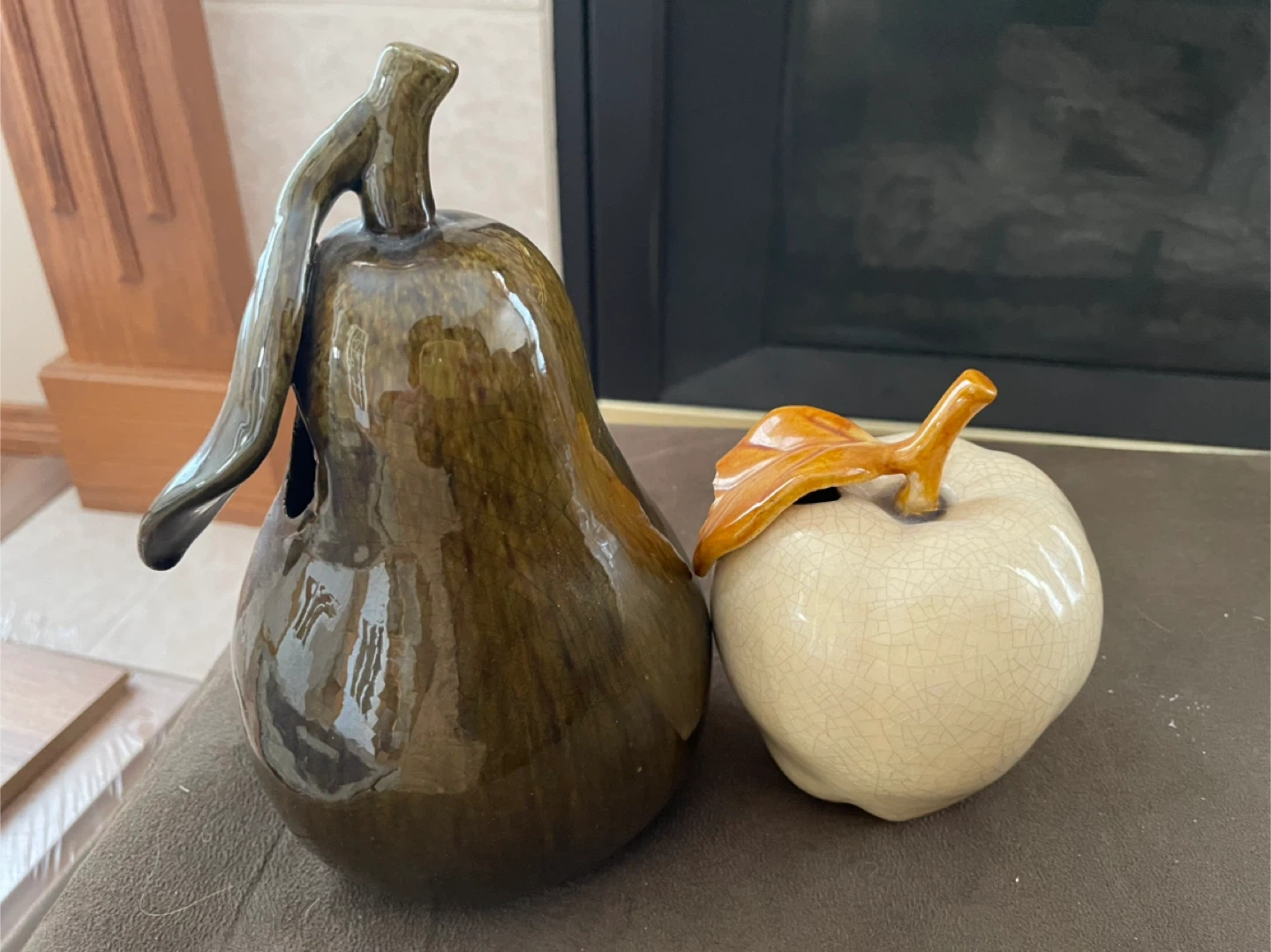 Decorative ceramic pear and apple set. The pear is dark green with a glossy finish, and the apple is cream-coloured with a crackle glaze. These pieces add a touch of seasonal charm to any tabletop.