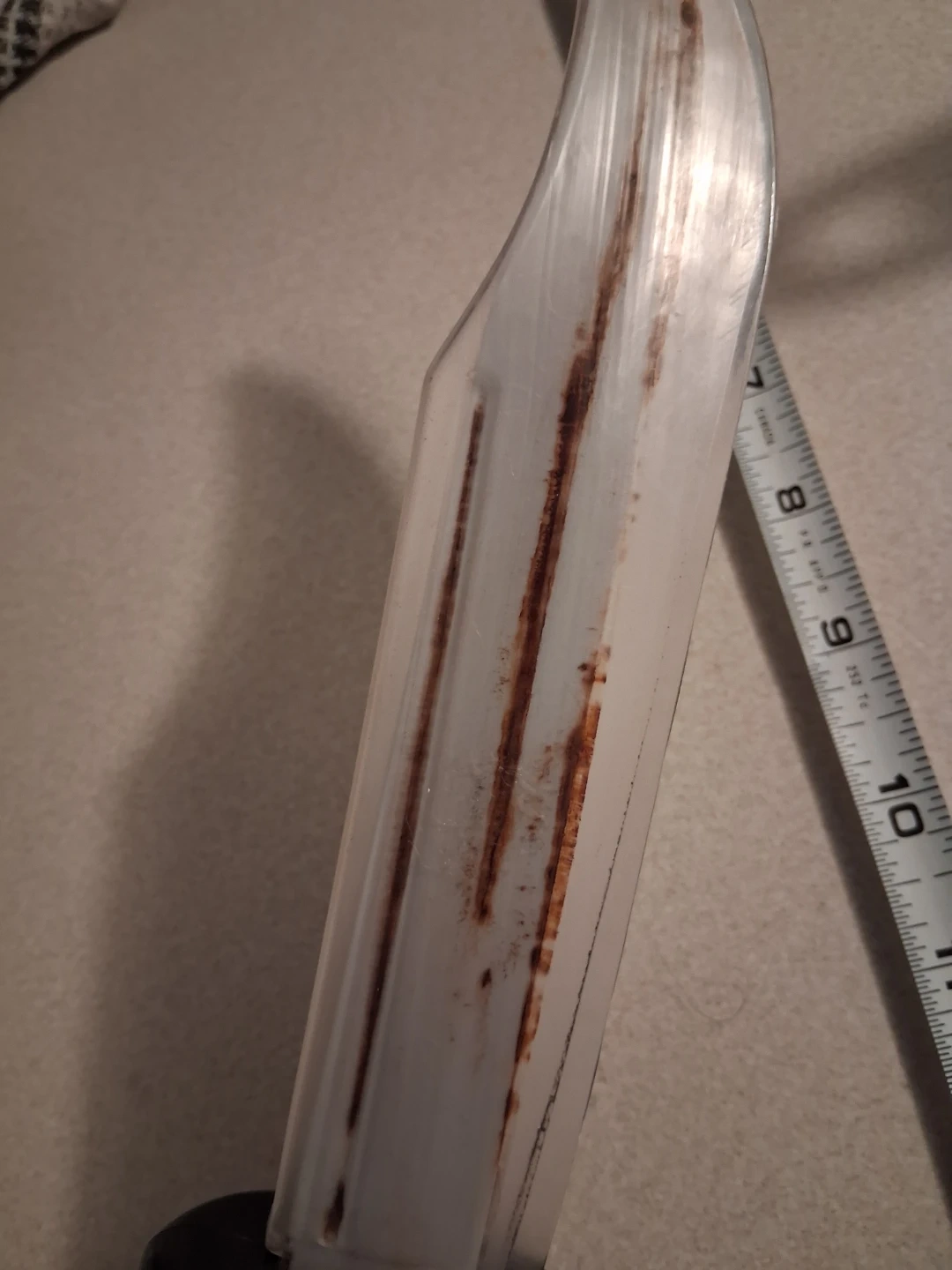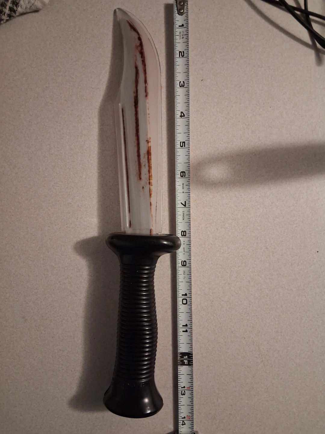 This is a toy knife made by Easter Unlimited. It's about 10 inches long. The blade has some markings on it.