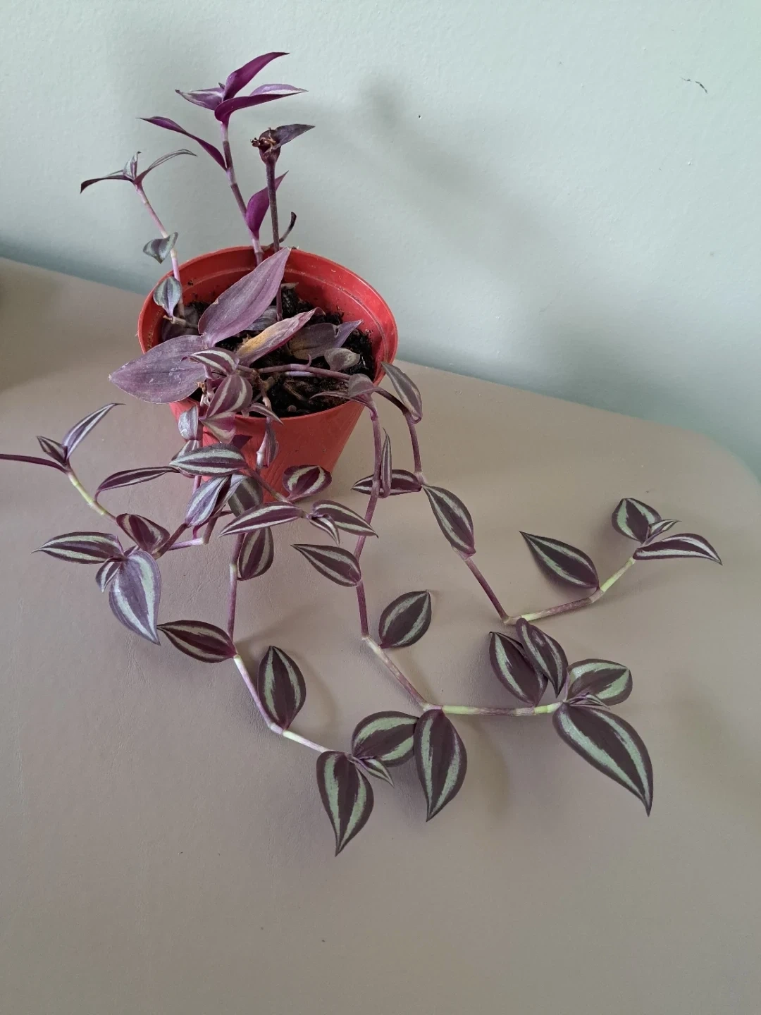 Tradescantia Zebrina plant in a red pot. Features striking purple and silver striped leaves on trailing stems. This plant adds a lovely splash of colour to any space!