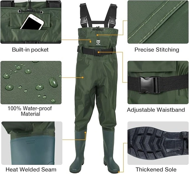 Please match the size selection to your normal shoe size. If your feet are wide or you need to wear thick socks, please choose one size larger than usual. These waders are 35% lighter than traditional rubber waders due to rugged nylon with two-ply upper fabric, making them easily fit into any backpack. You'll hardly feel tired when fighting with big fish! The nylon-reinforced PVC upper with waterproof boot attachment and taped seams guarantee 100% waterproof reliability. Water intrusion resistance processing helps seal out water and dirt during long days on the water. Features adjustable H-back web suspenders with durable quick release buckles, a flip-out chest pocket, and a top draw cord for convenience. Boot hangers are provided. A 100% waterproof phone case is included to protect your belongings. Designed to keep you dry and warm on your fishing adventures, hunting, farming work, or any messy situation. Waders sizes range from 7 to 14 (please refer to size chart). Condition: New. For Sale By: Owner.