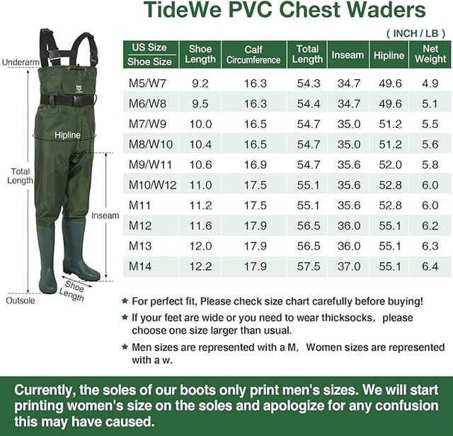 Please match the size selection to your normal shoe size. If your feet are wide or you need to wear thick socks, please choose one size larger than usual. These waders are 35% lighter than traditional rubber waders due to rugged nylon with two-ply upper fabric, making them easily fit into any backpack. You'll hardly feel tired when fighting with big fish! The nylon-reinforced PVC upper with waterproof boot attachment and taped seams guarantee 100% waterproof reliability. Water intrusion resistance processing helps seal out water and dirt during long days on the water. Features adjustable H-back web suspenders with durable quick release buckles, a flip-out chest pocket, and a top draw cord for convenience. Boot hangers are provided. A 100% waterproof phone case is included to protect your belongings. Designed to keep you dry and warm on your fishing adventures, hunting, farming work, or any messy situation. Waders sizes range from 7 to 14 (please refer to size chart). Condition: New. For Sale By: Owner.