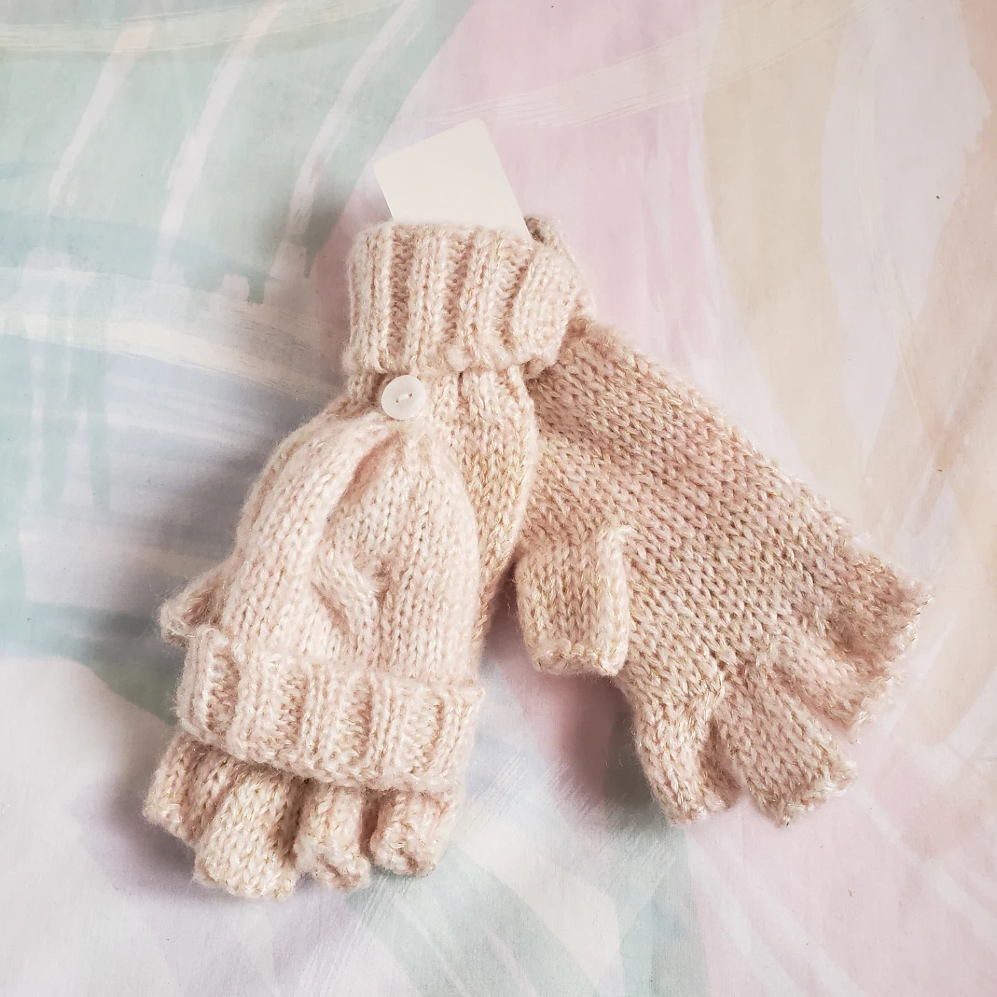 Selling a pair of light pink knitted gloves with finger holes