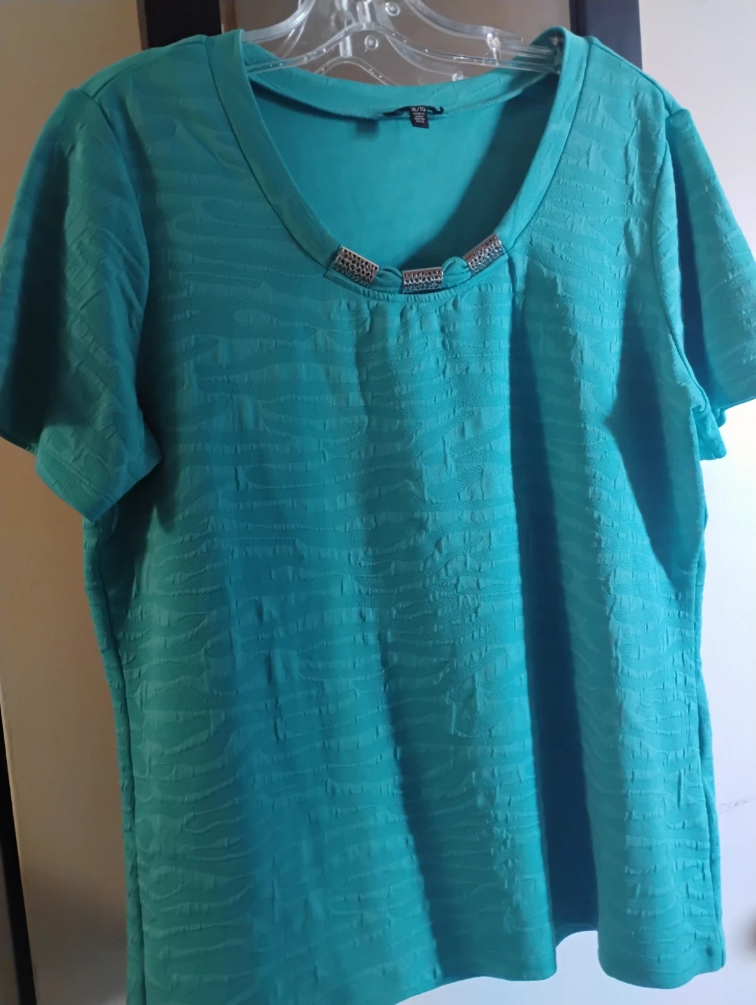 This teal short-sleeve top features a textured pattern all over and decorative detail at the neckline.