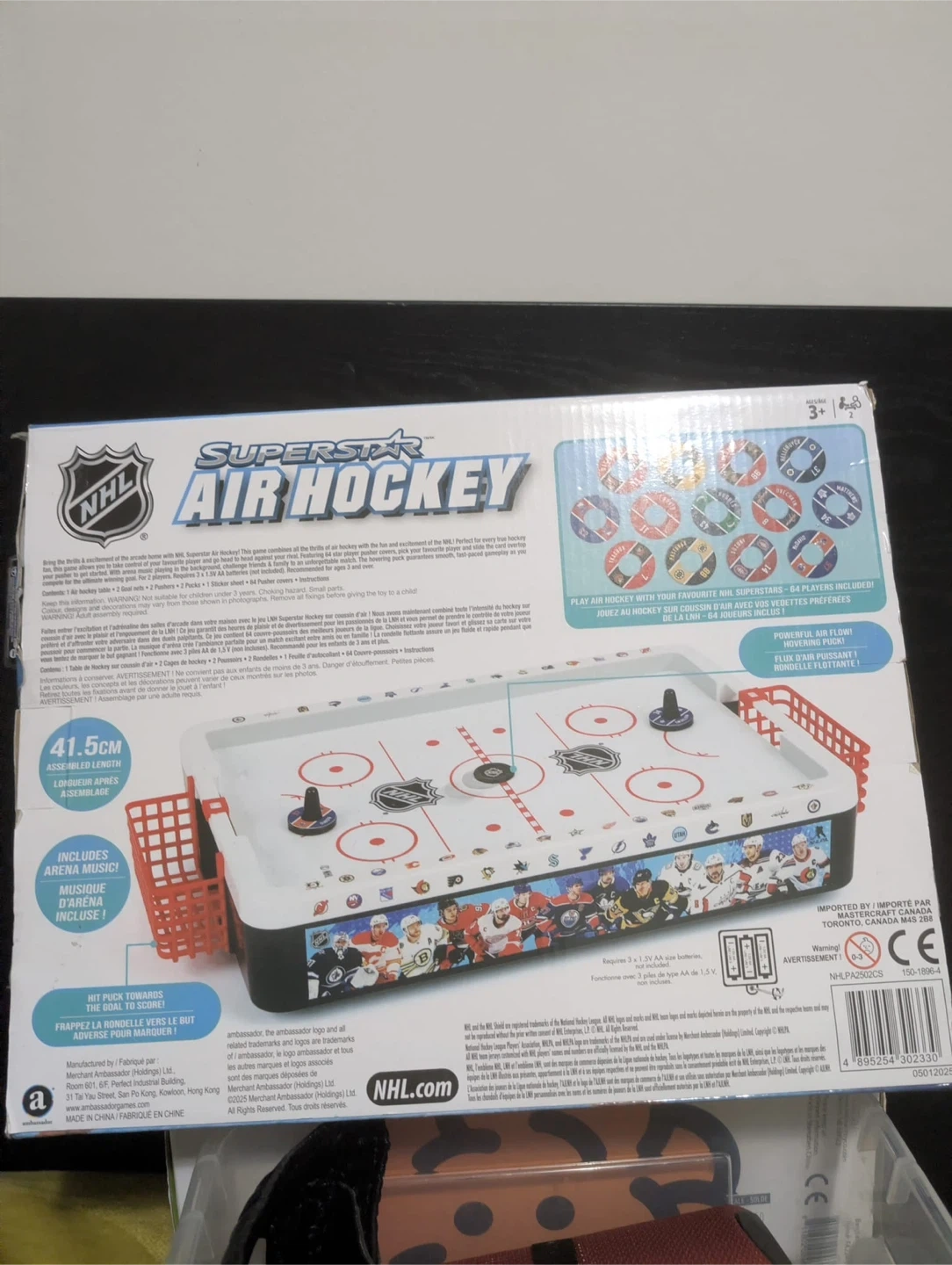 Bring the excitement of NHL Superstar Air Hockey home! This tabletop game comes with all the fun of air hockey and the thrill of the NHL. It features a 41.5cm assembled length. Includes arena, 2 pushers, and 2 pucks. Batteries not included.