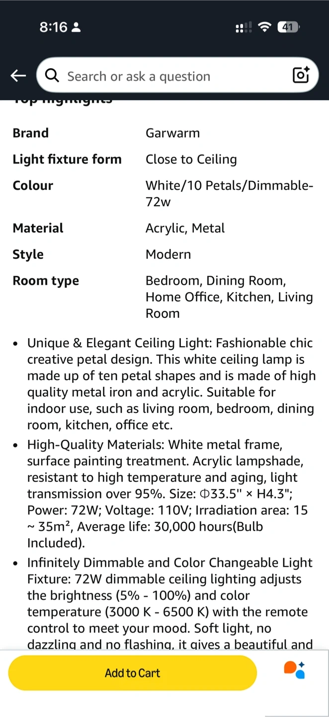 Selling a Garwarm dimmable LED ceiling light. It's a modern 72W light with a unique flower shape. The light fixture form is close to the ceiling. Made with high-quality metal and acrylic materials. Perfect for a bedroom, dining room, home office, kitchen, or living room. Size is Φ33.5" x H4.3".