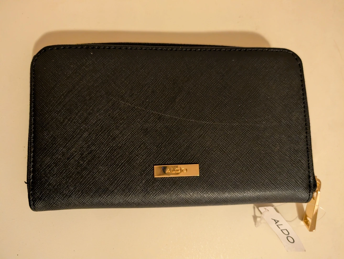 This is a new black zip-around wallet by ALDO. It's made of textured leather. This wallet is great for organizing your cards and cash!