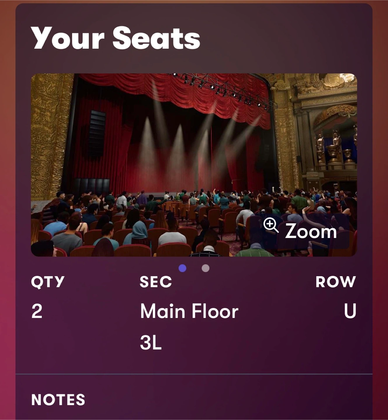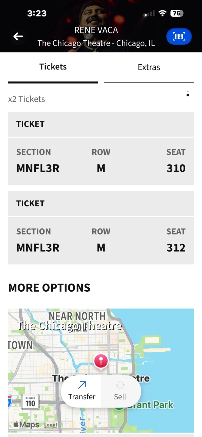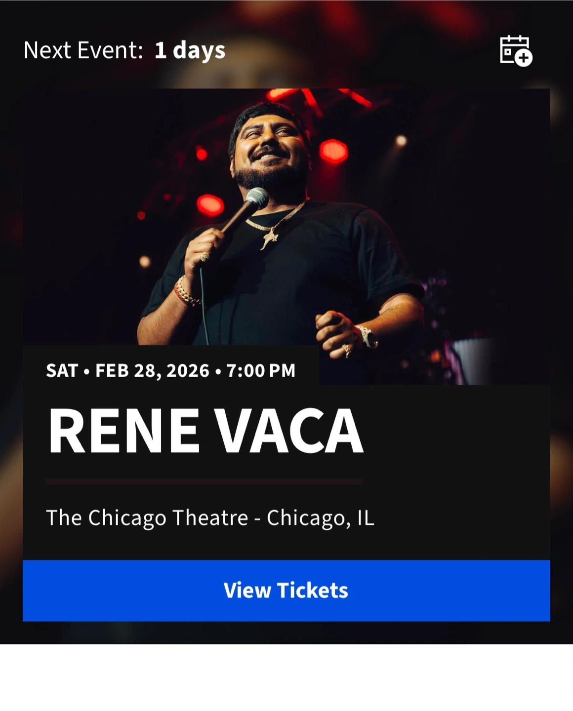 Two tickets to see Rene Vaca at each ticket 120$ The Chicago Theatre on Saturday, February 28, 2026, at 7:00 PM. Seats are located on the Main Floor in Row M, Seats 310 and 312.