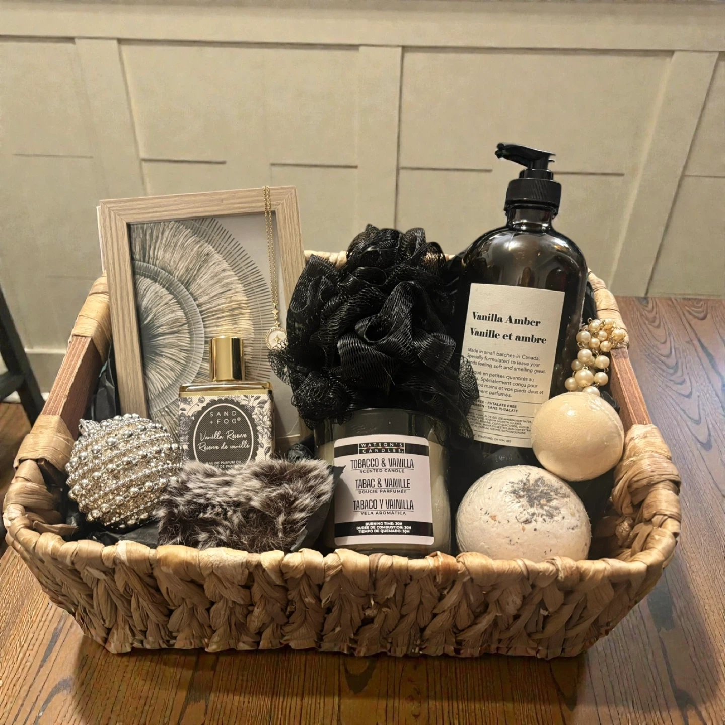 Selling a bath and body gift basket! It includes a Sand + Fog Vanilla Reserve perfume oil, Tobacco & Vanilla scented candle, Vanilla Amber Lotion , Chai tea Bath Bomb, vanilla bath bomb, a necklace, faux fur hair scrunchie, Framed art and abath loofah for a relaxing spa day at home. All in a reusable basket. Can wrap in cellophane.