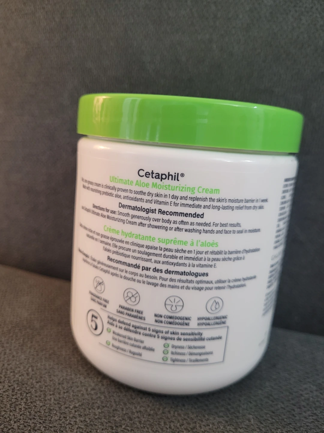 Cetaphil Ultimate Aloe Moisturizing Cream. It's formulated with nourishing Prebiotic Aloe & Antioxidants. This cream helps soothe dry skin and replenish its moisture barrier. It's fragrance-free, paraben-free, and hypoallergenic.