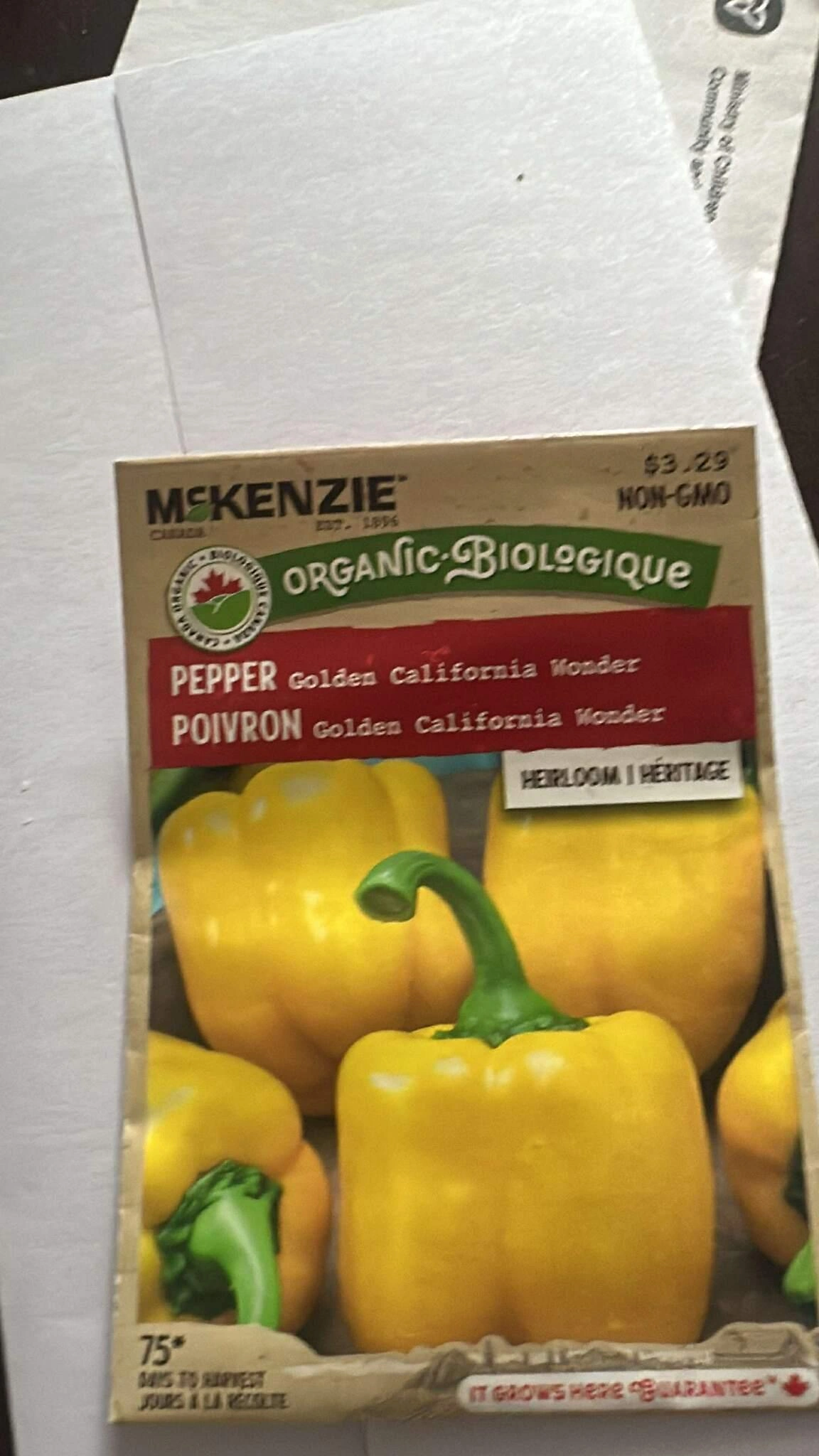 Selling 2 packs of McKenzie Organic Golden California Wonder Pepper seeds for $1.50 each! The packet says it takes about 75 days to harvest. Originally priced at $3.29.