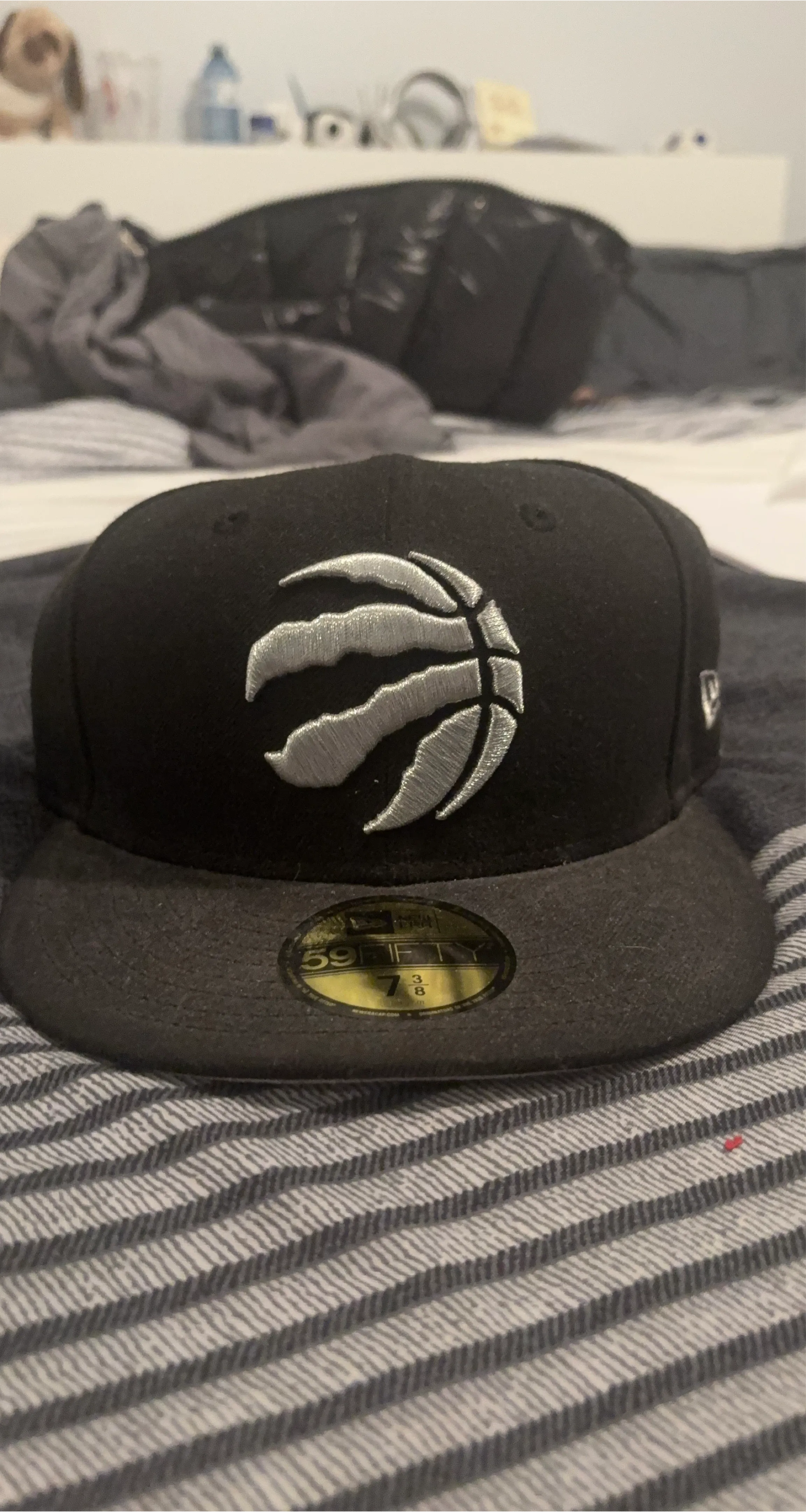 Selling a New Era Toronto Raptors fitted hat. It's black with the Raptors logo on the front. The size is 7 3/8. In great condition!