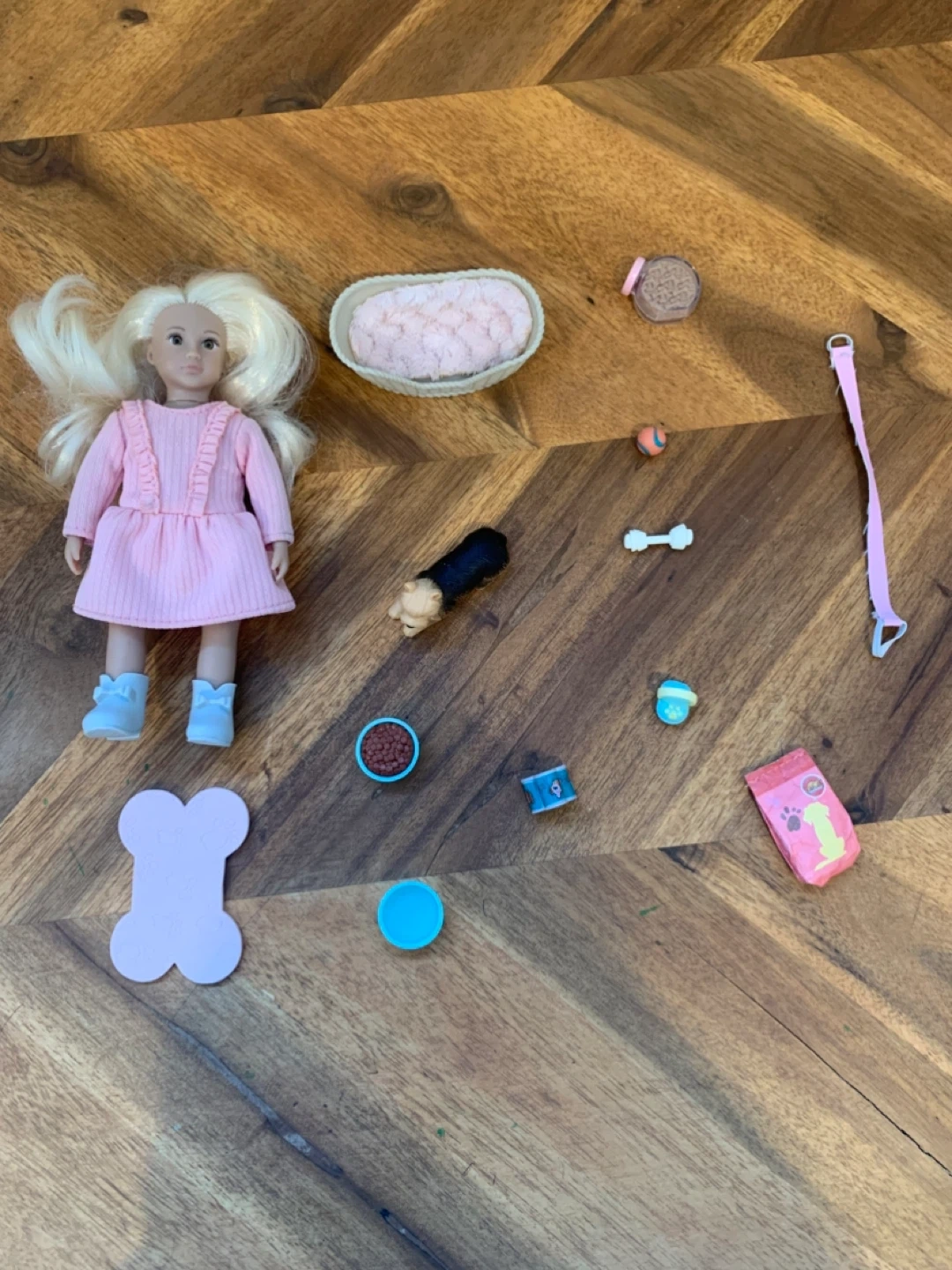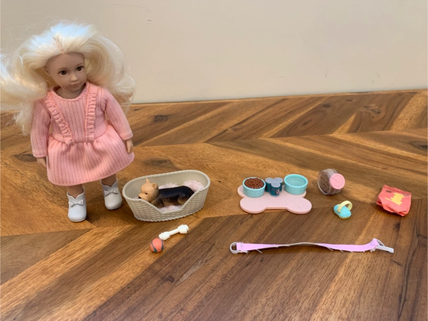 This set includes a mini doll wearing a pink dress and white boots, along with a small toy dog. It comes with various pet accessories like a dog bed, food bowls, a leash, and toys. Great for imaginative play!