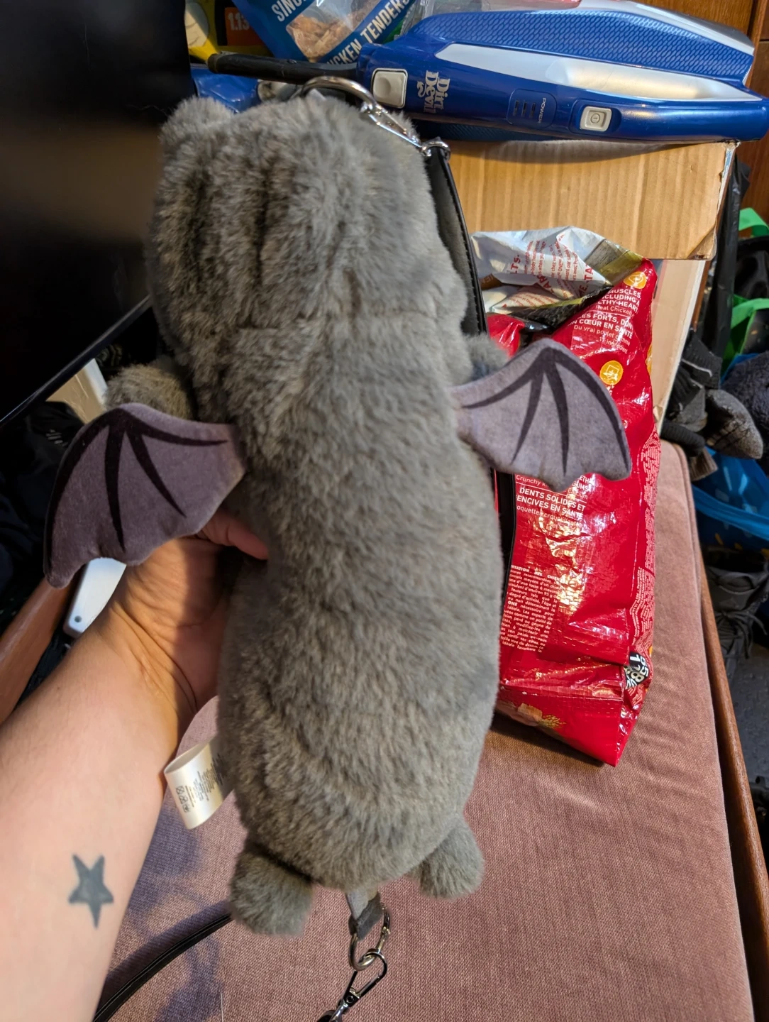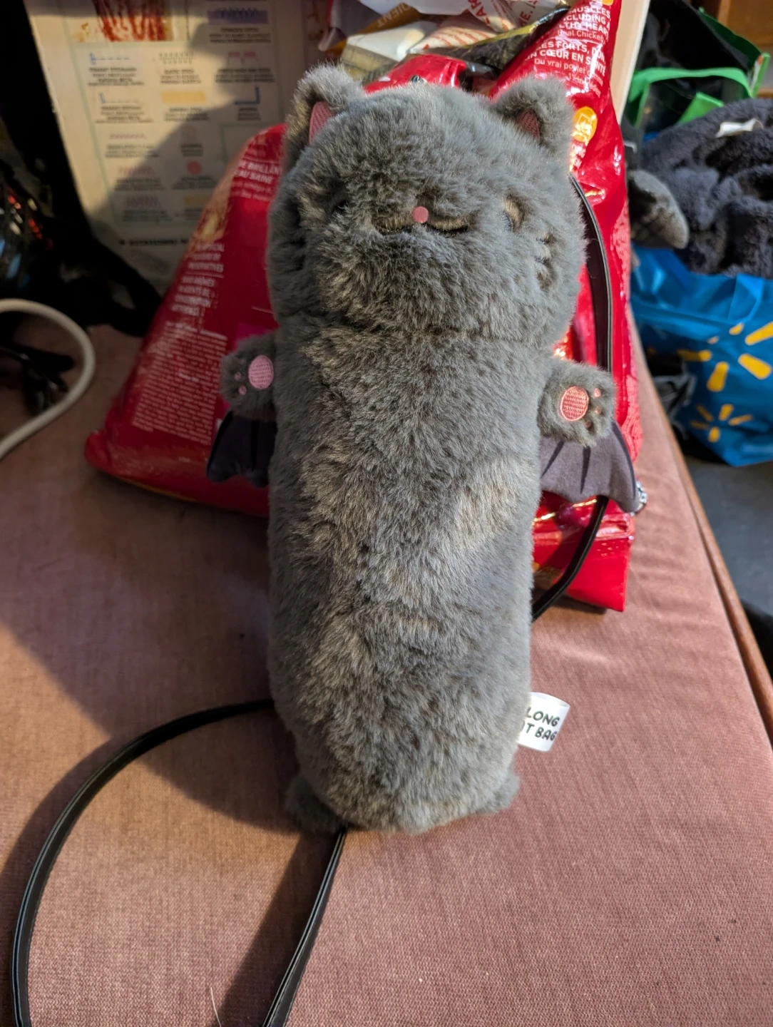 Super soft grey bat cat plush pouch with a zippered opening. It's got adorable little wings and paws! Perfect for storing small items.