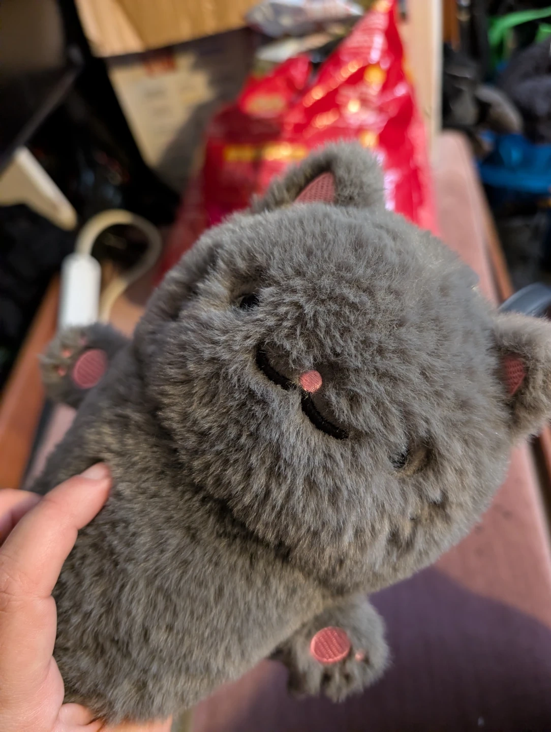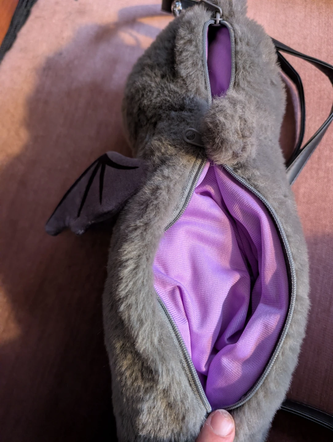 Super soft grey bat cat plush pouch with a zippered opening. It's got adorable little wings and paws! Perfect for storing small items.